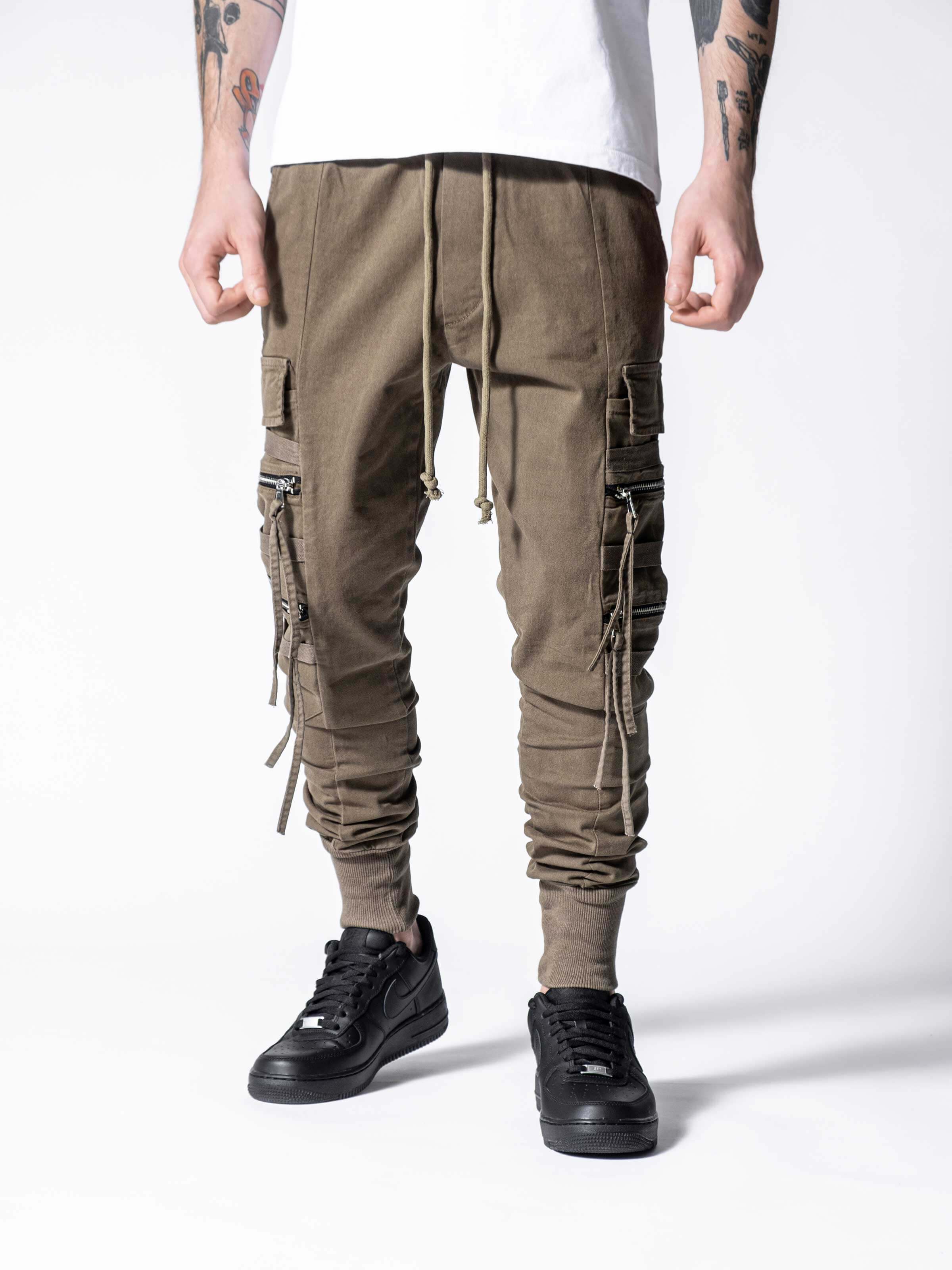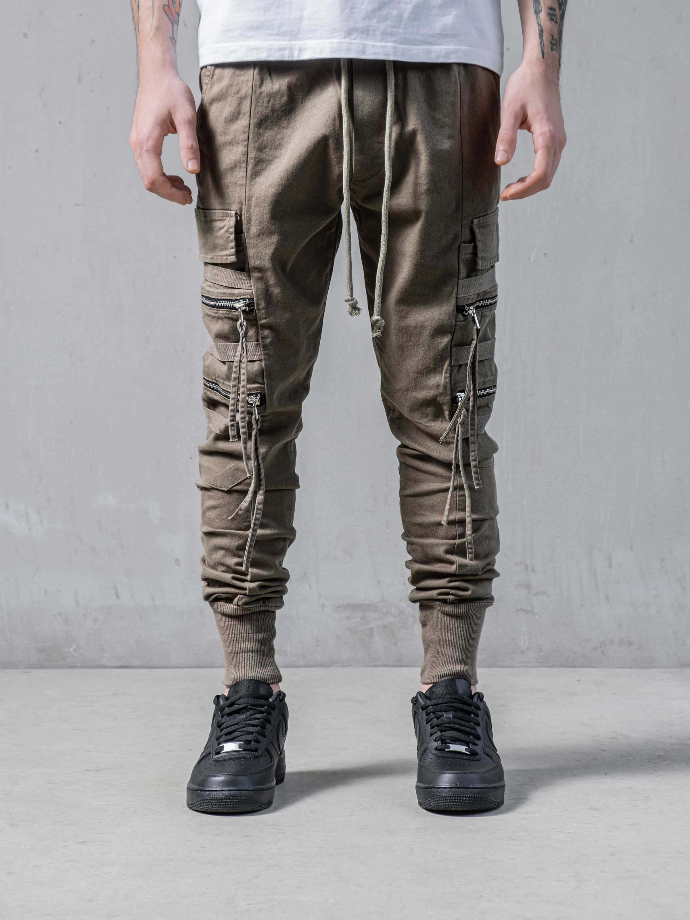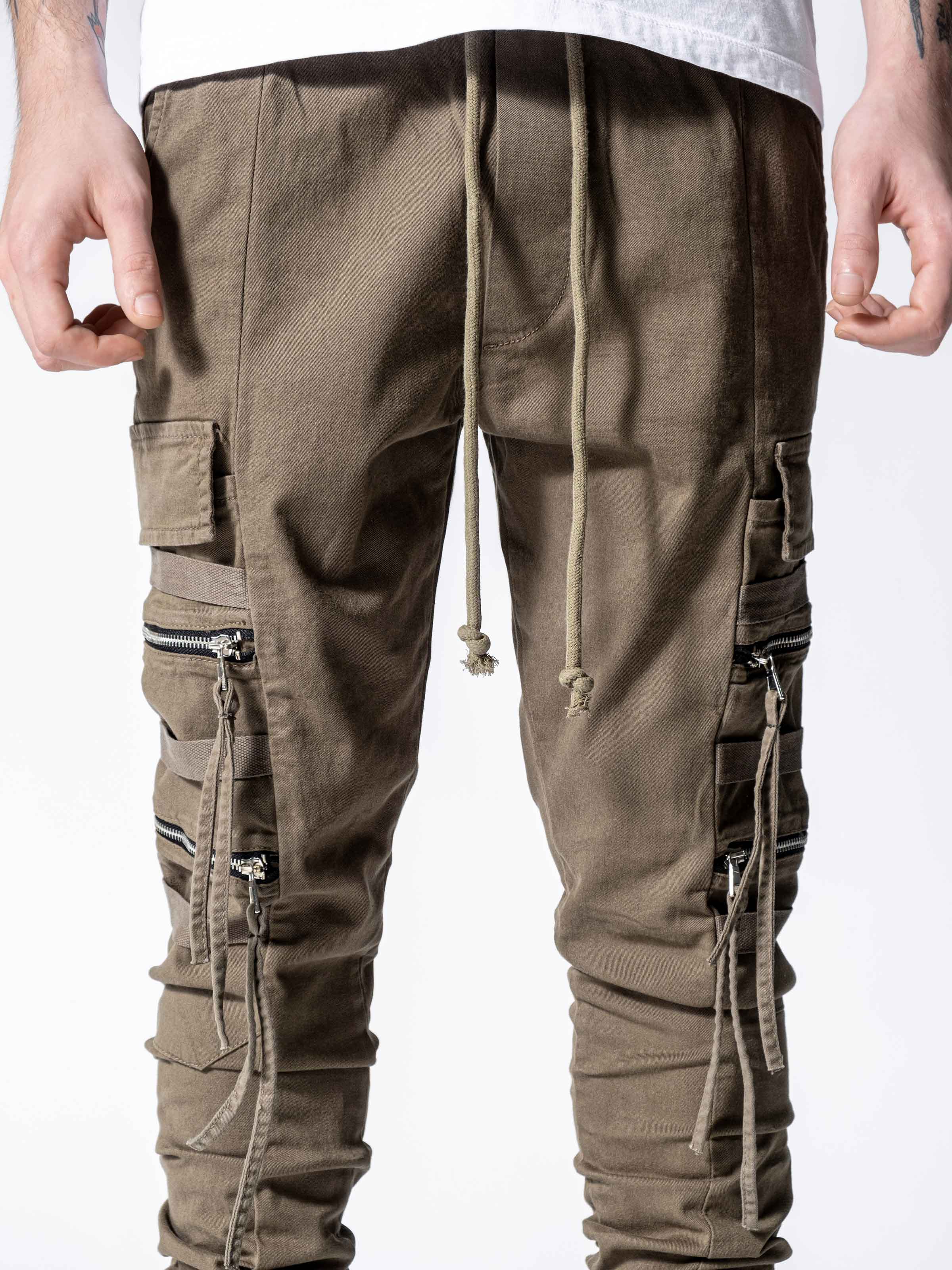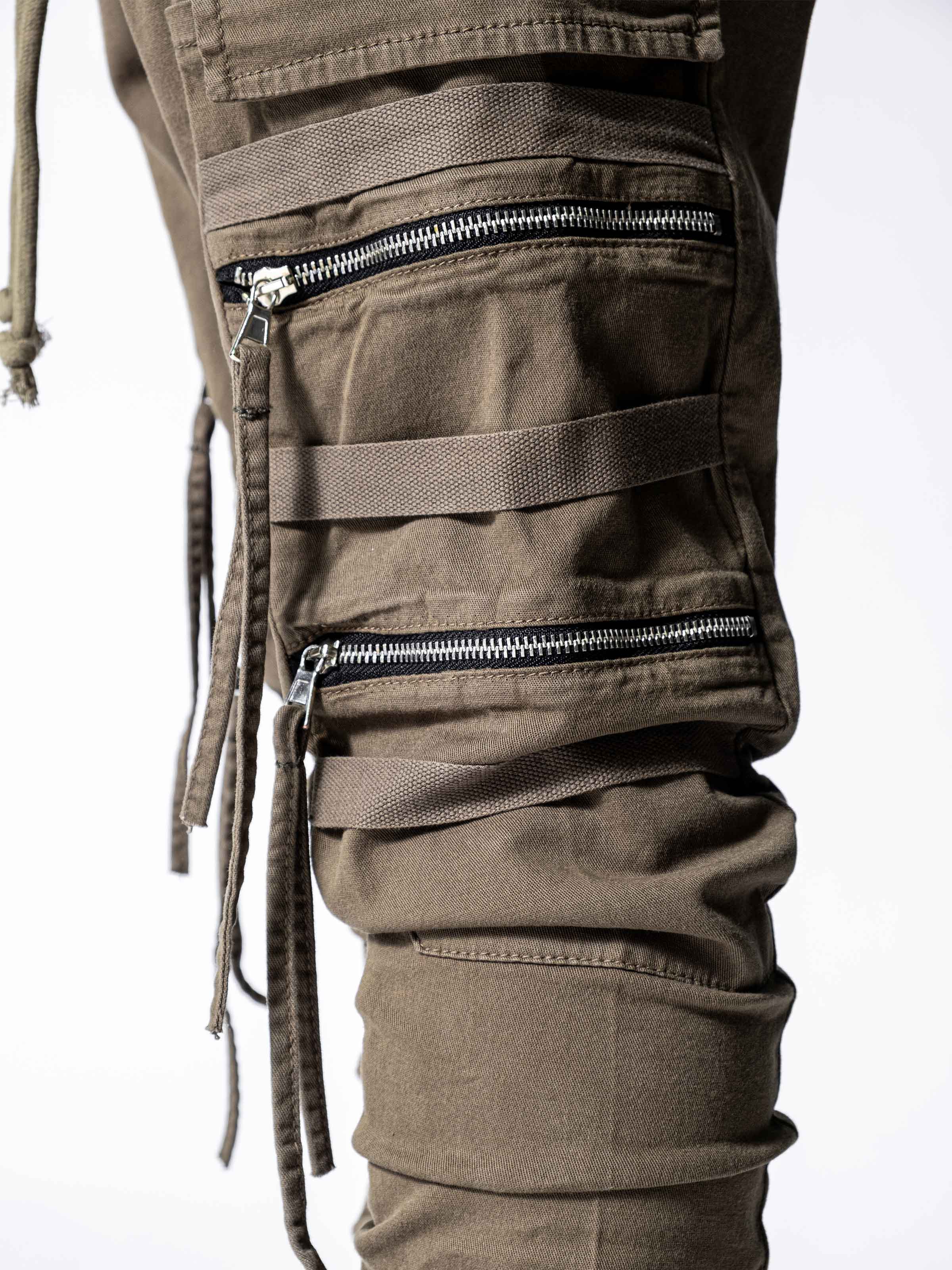 These pants have a little bit different look than other cargo pants at monocloth. You can see fringed details at end of the zipper handles and It is listed on both leg openings and waist. It is a skinny fit and comfortable at the same time. You gotta try.
