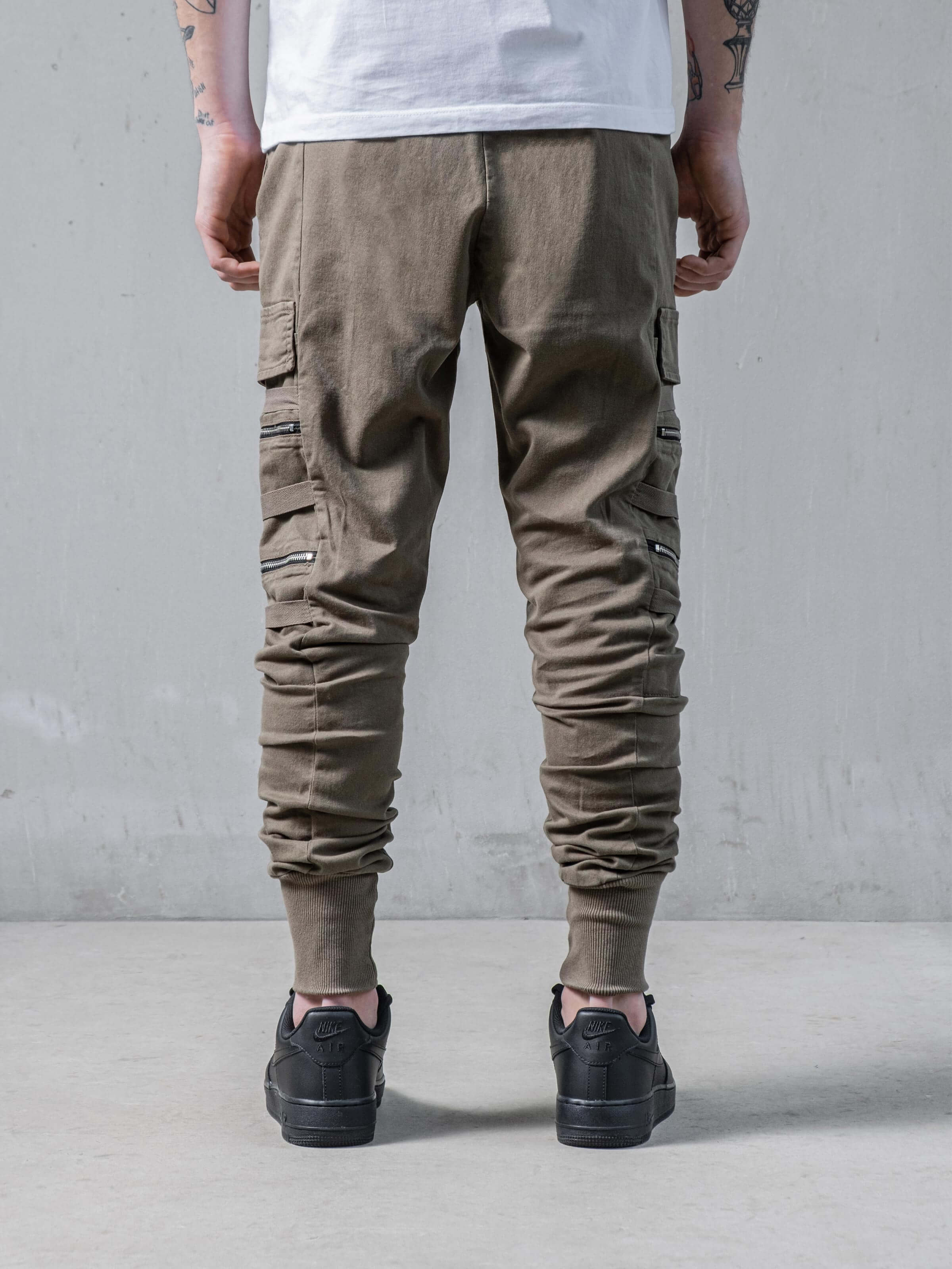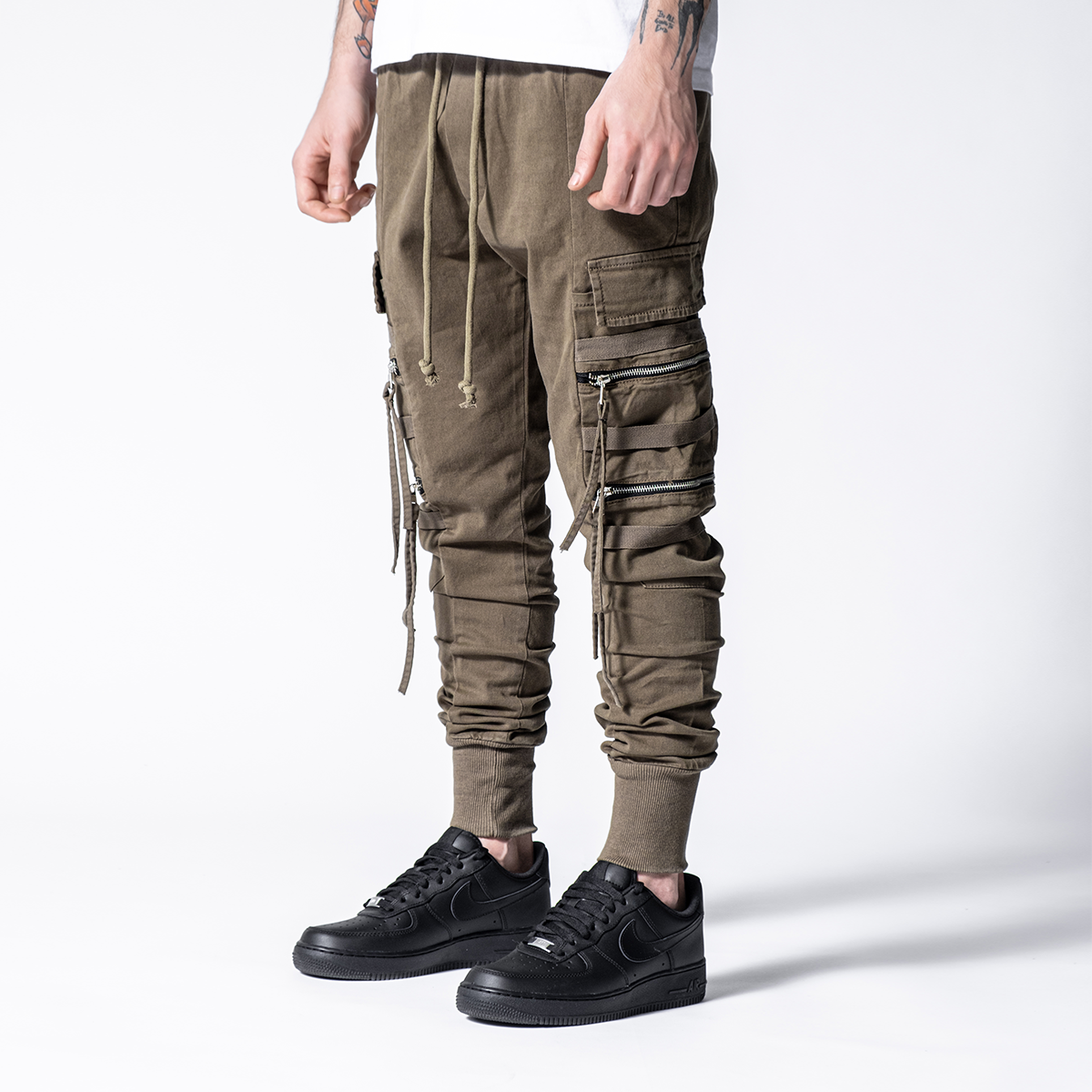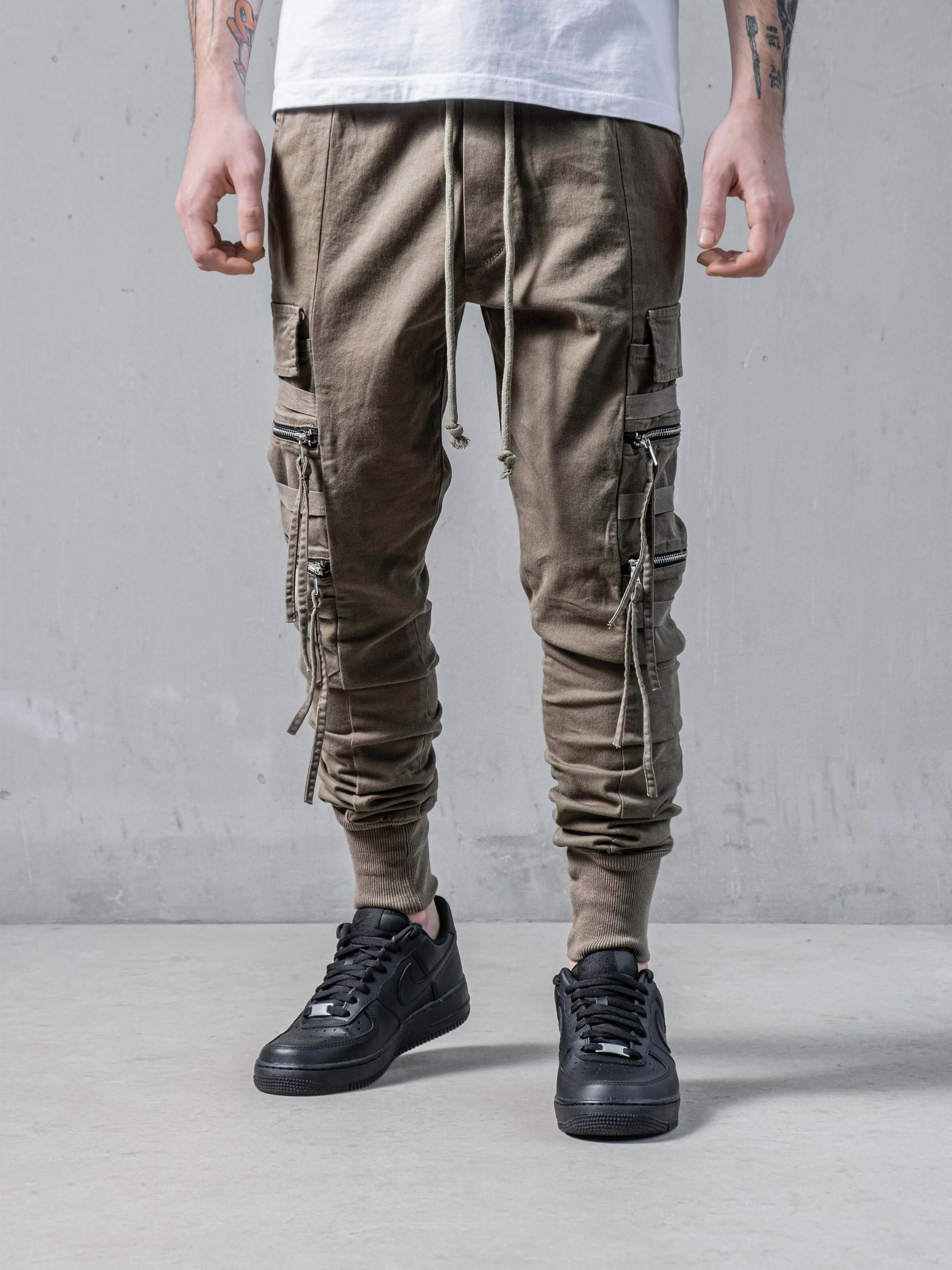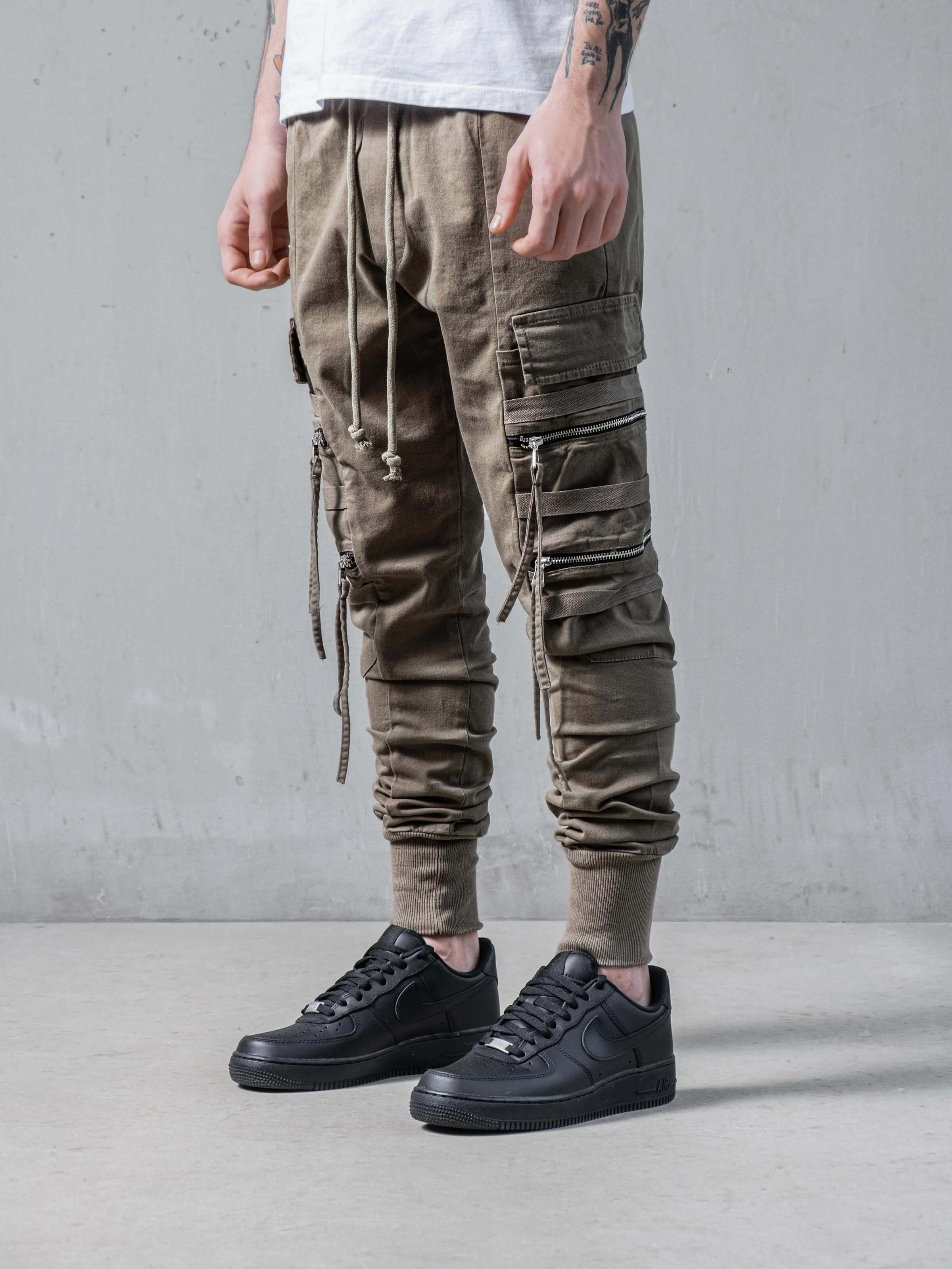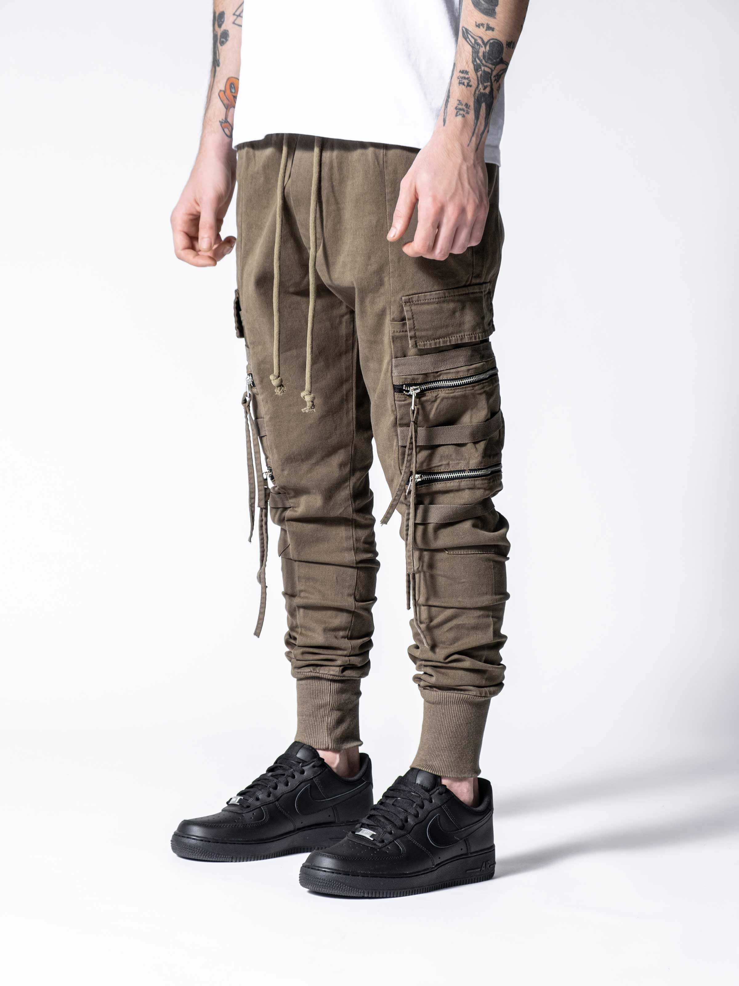 These pants have a little bit different look than other cargo pants at monocloth. You can see fringed details at end of the zipper handles and It is listed on both leg openings and waist. It is a skinny fit and comfortable at the same time. You gotta try.