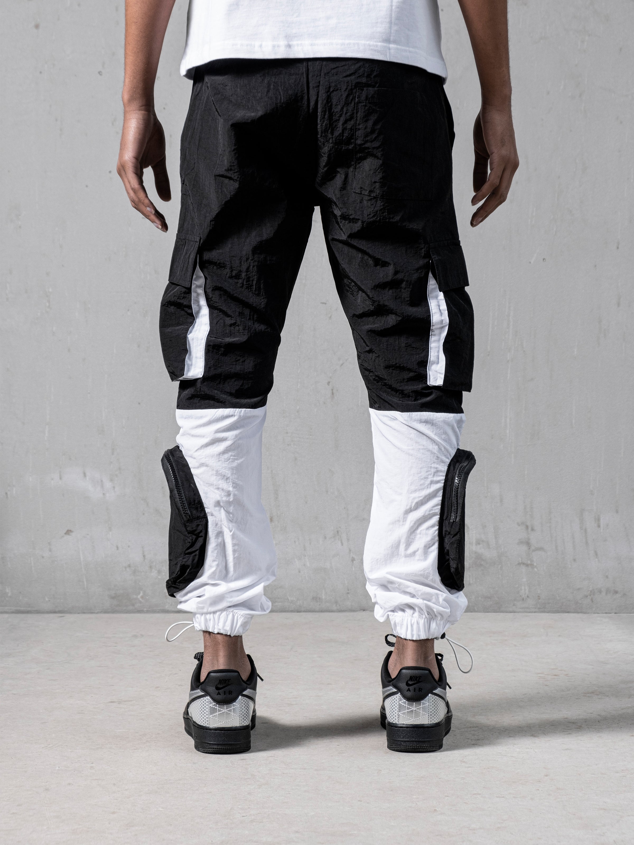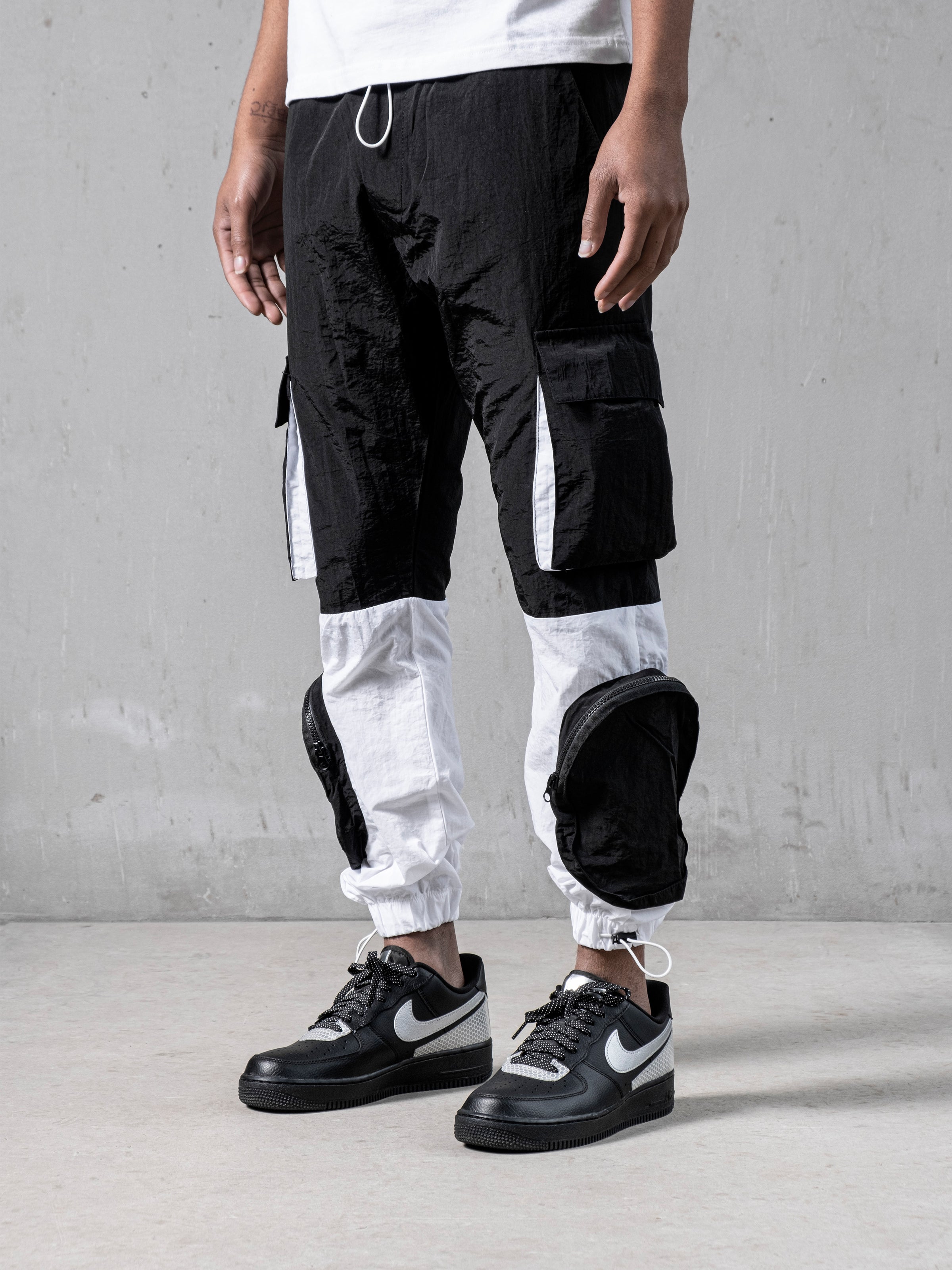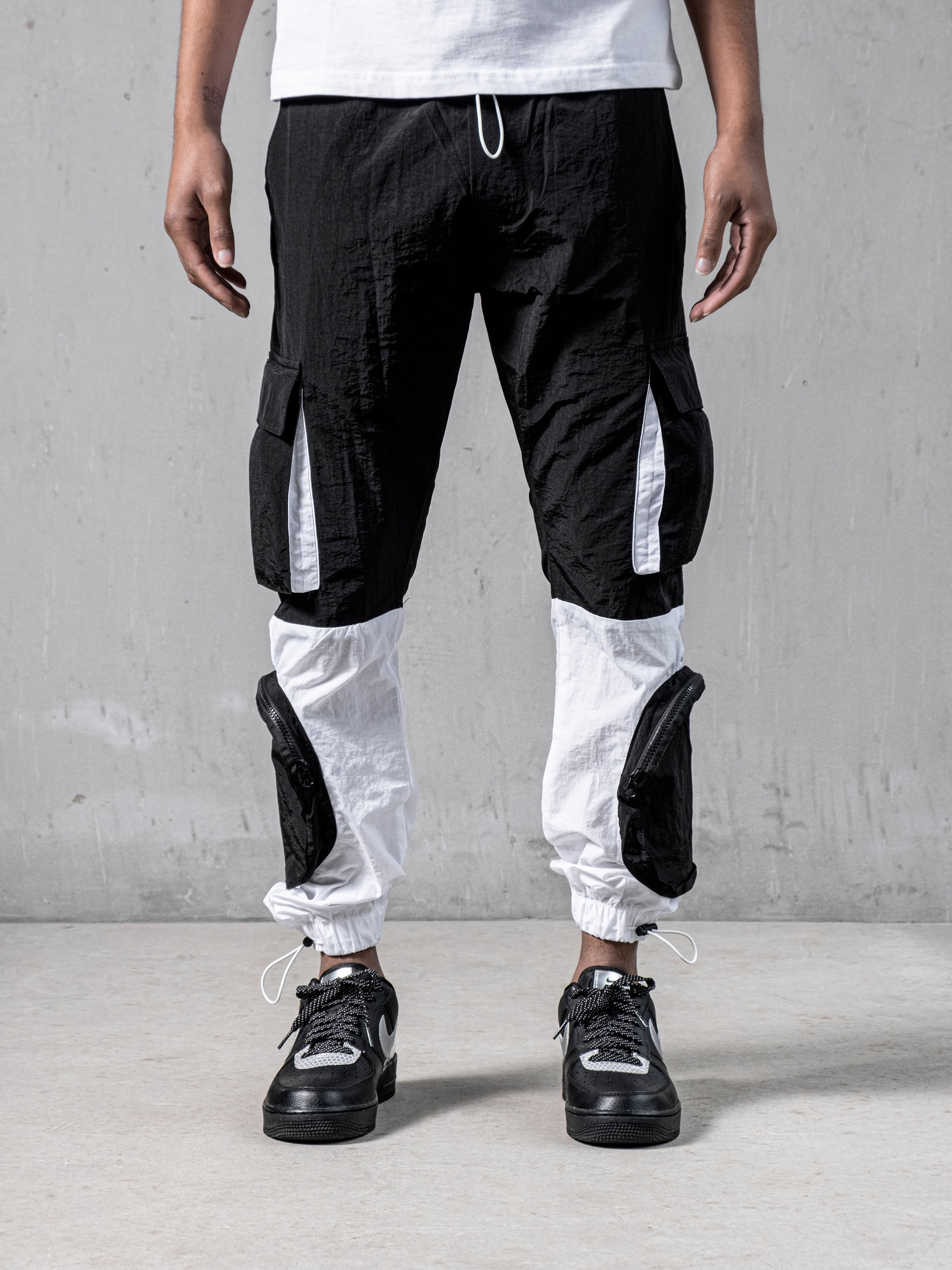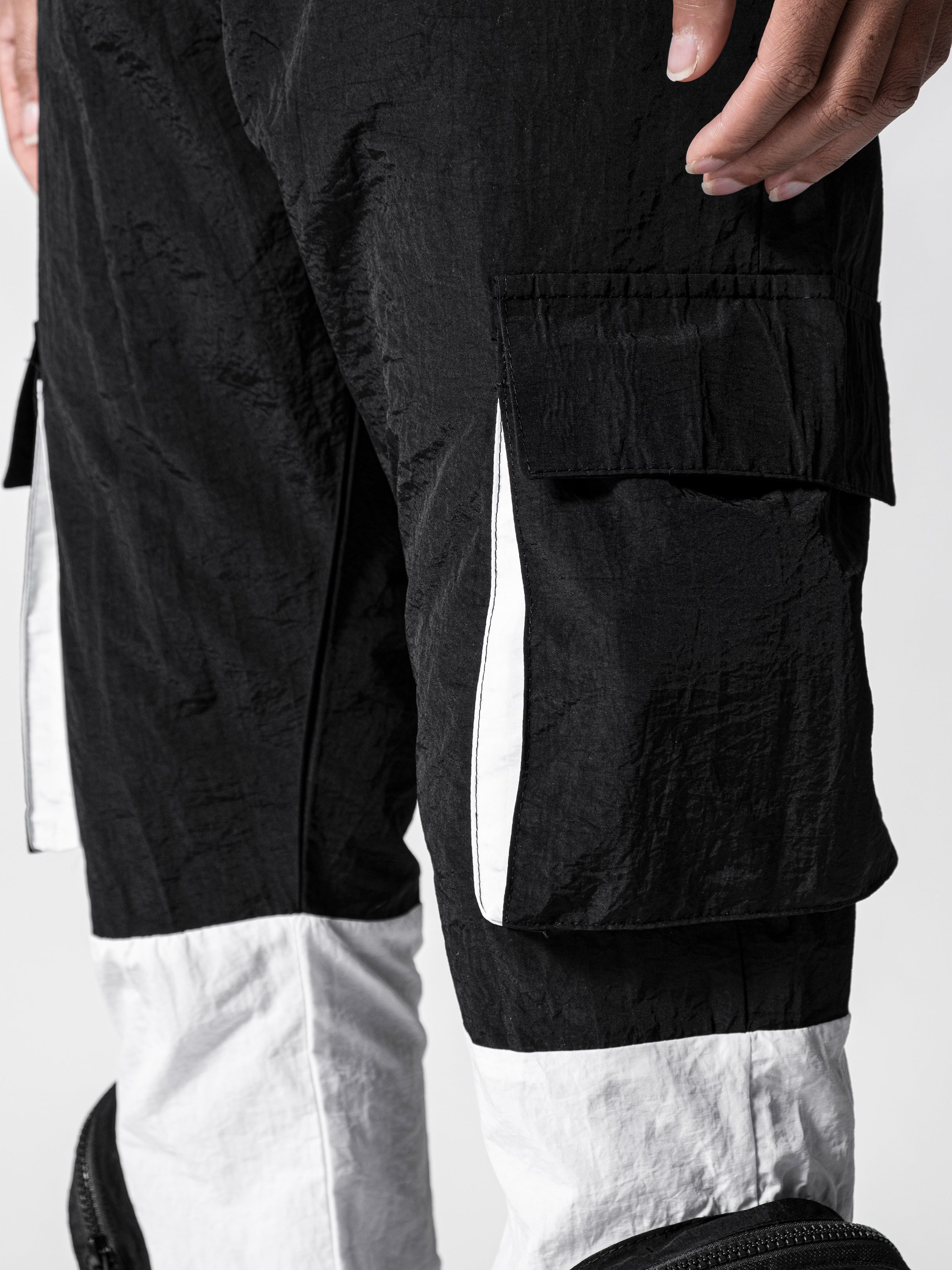 Black and White Parachute Cargos are made from light parachute fabric. It has seven pockets; 4 cargo pockets and 3 normal pockets. It is fresh and relaxed cargo pants for summer