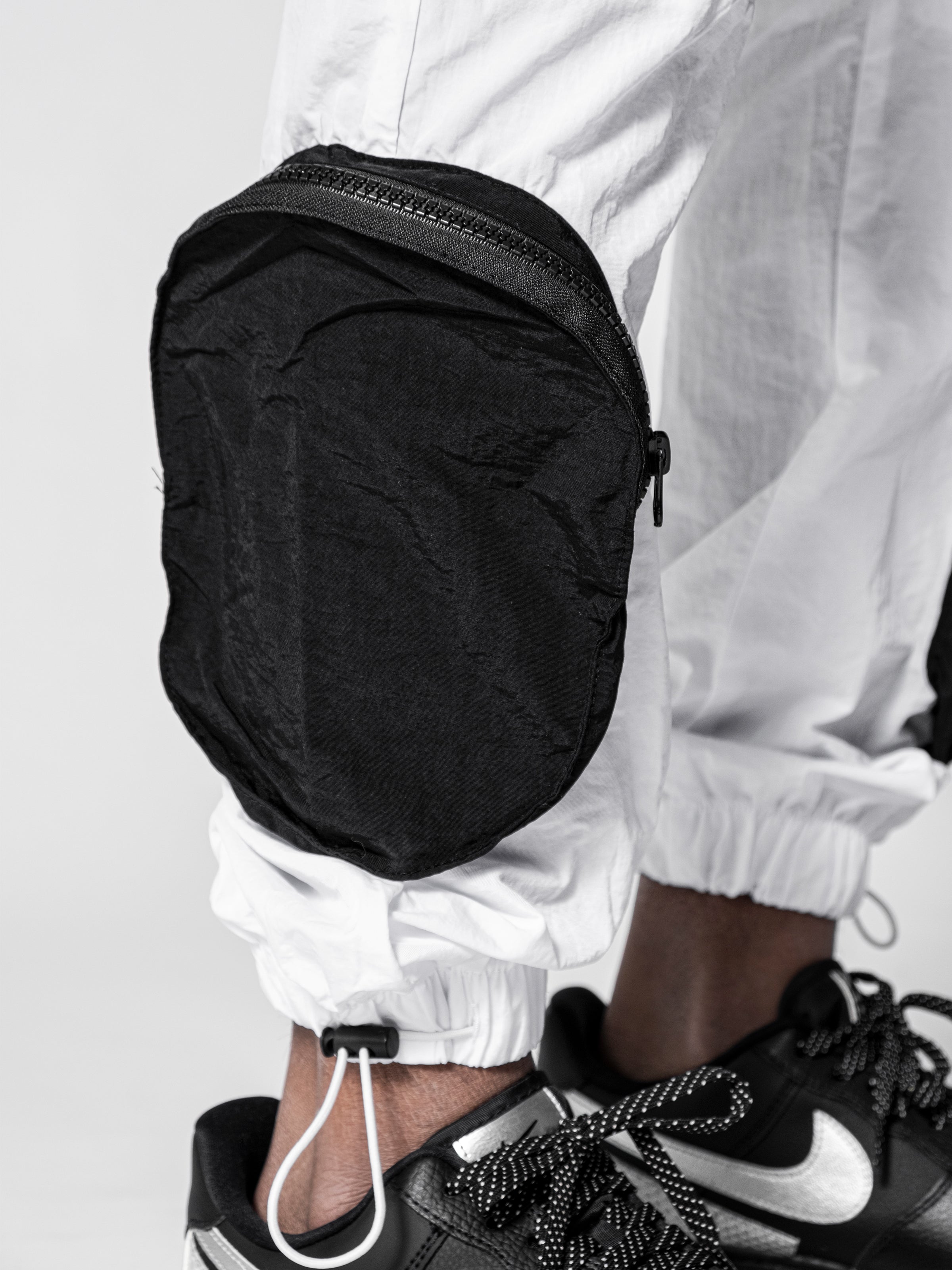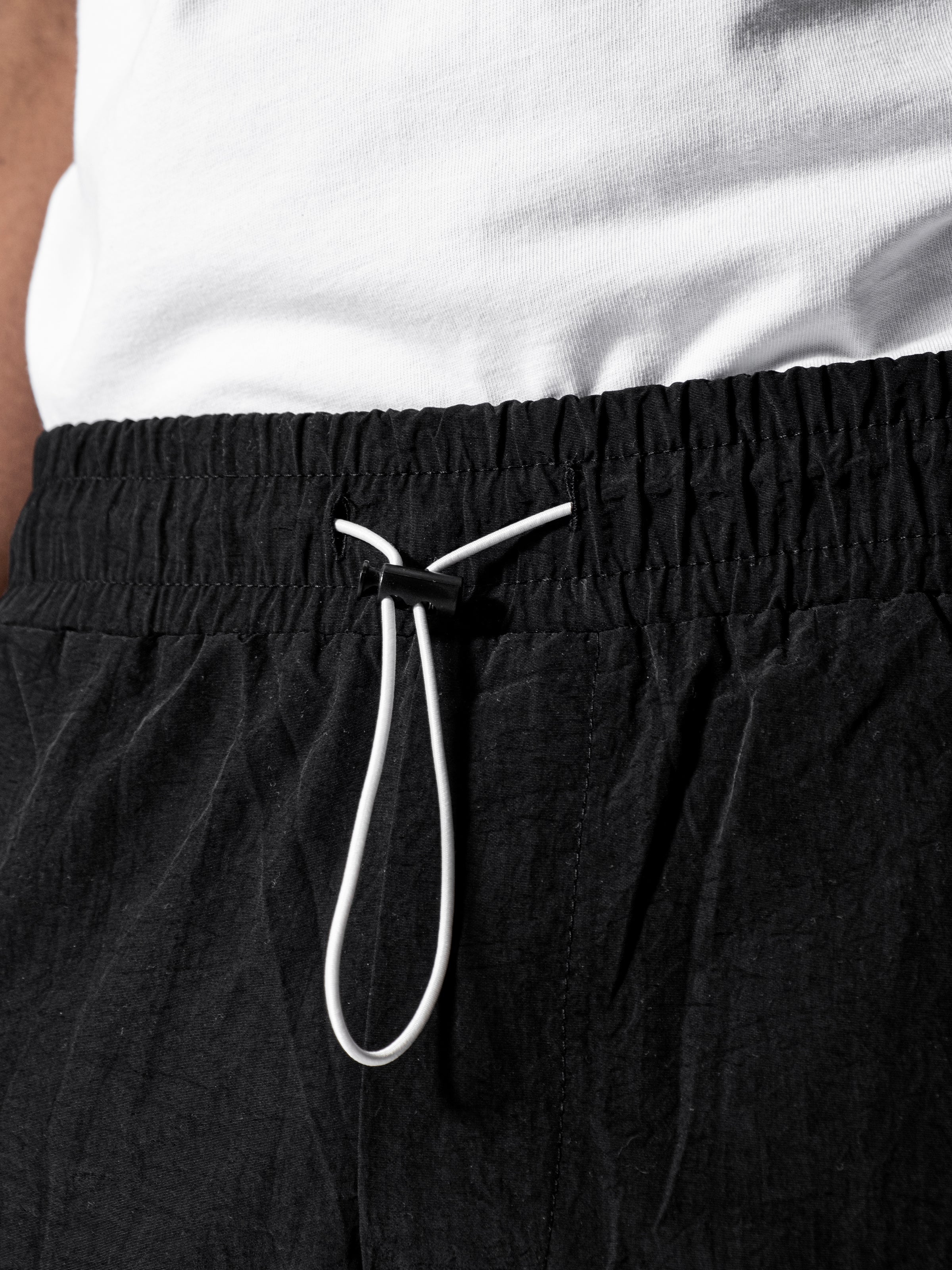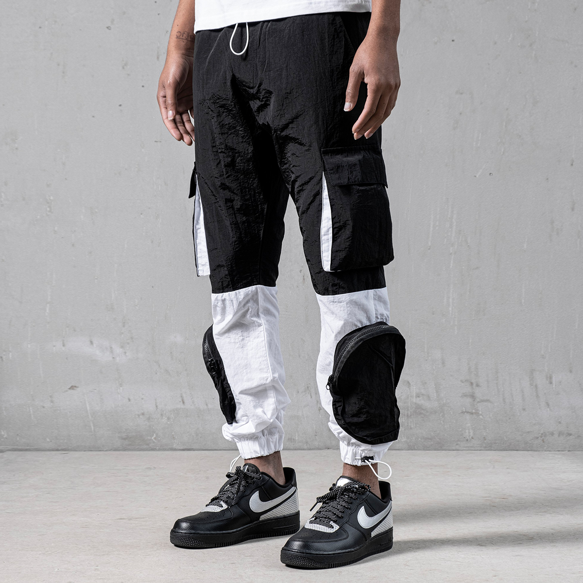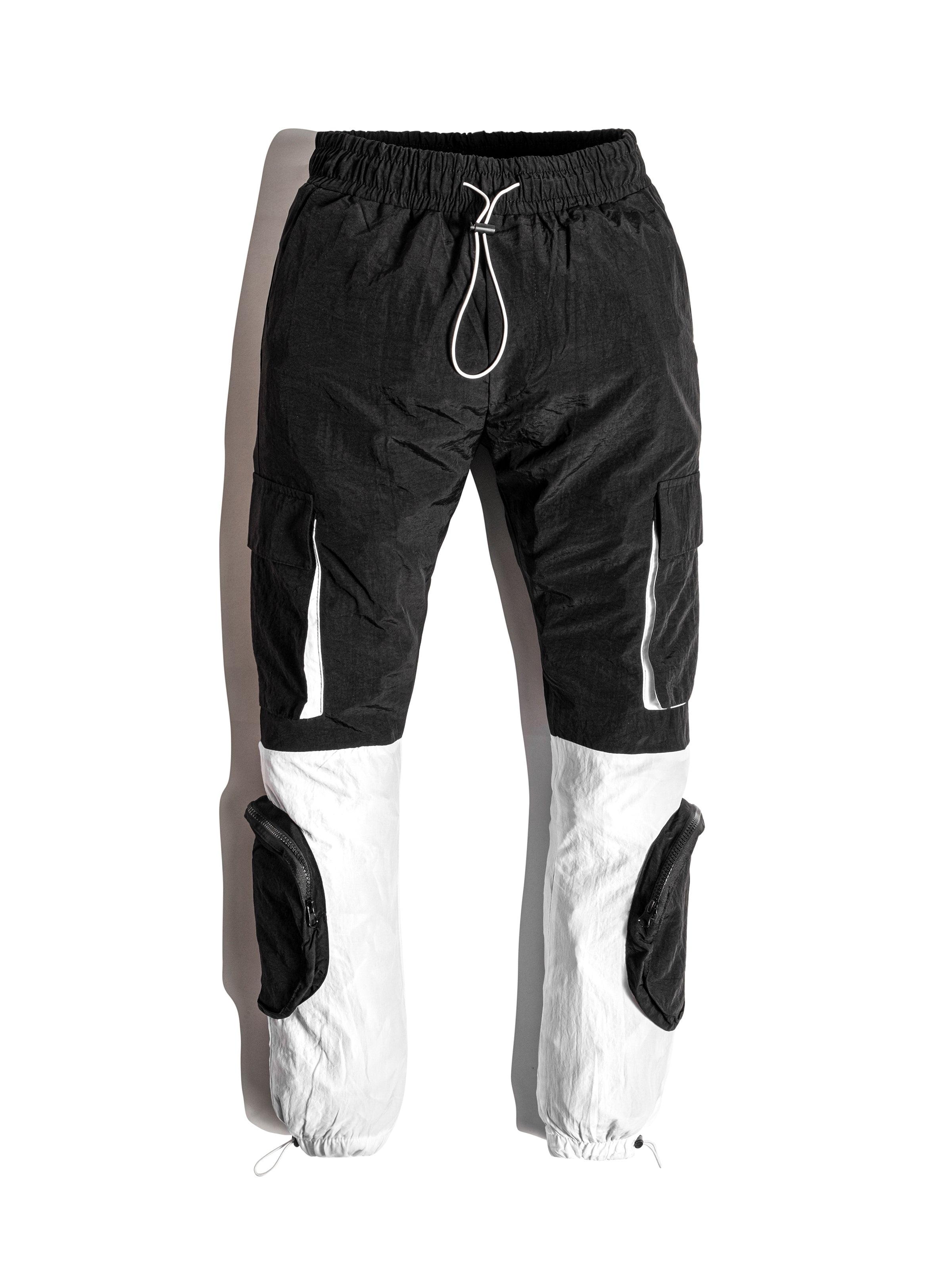 Black and White Parachute Cargos are made from light parachute fabric. It has seven pockets; 4 cargo pockets and 3 normal pockets. It is fresh and relaxed cargo pants for summer