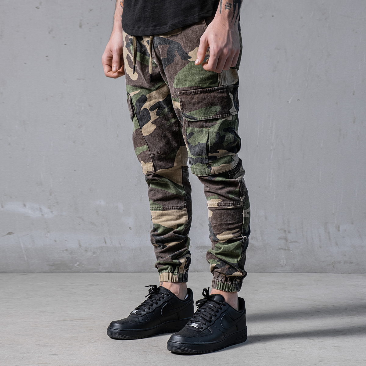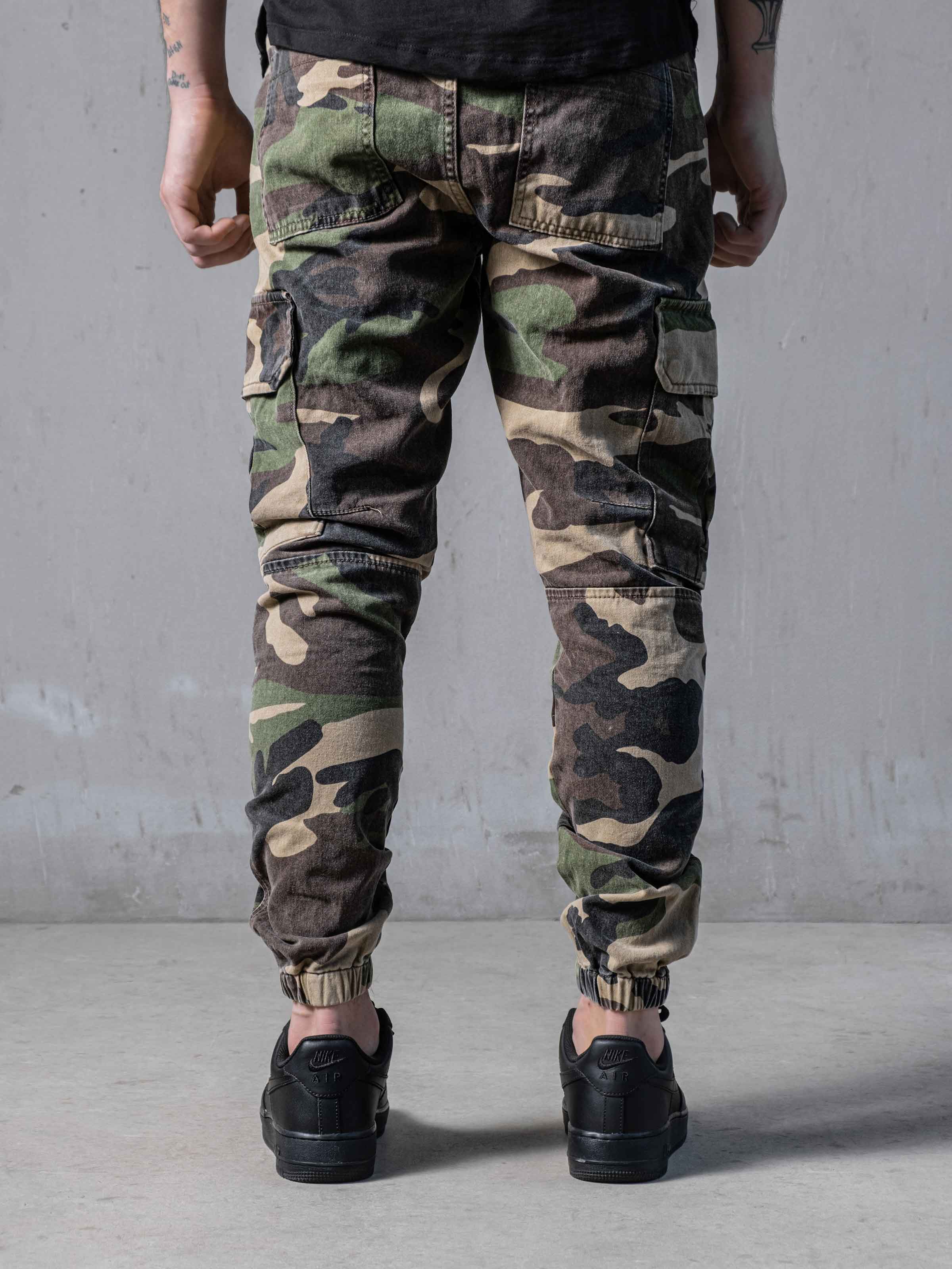 Camo Cargo Pants are made from stretchy camo denim fabric. Ith is skinny-fit denim and it gets skinnier through ankles. As you can see elasticized at the ankles and waist.