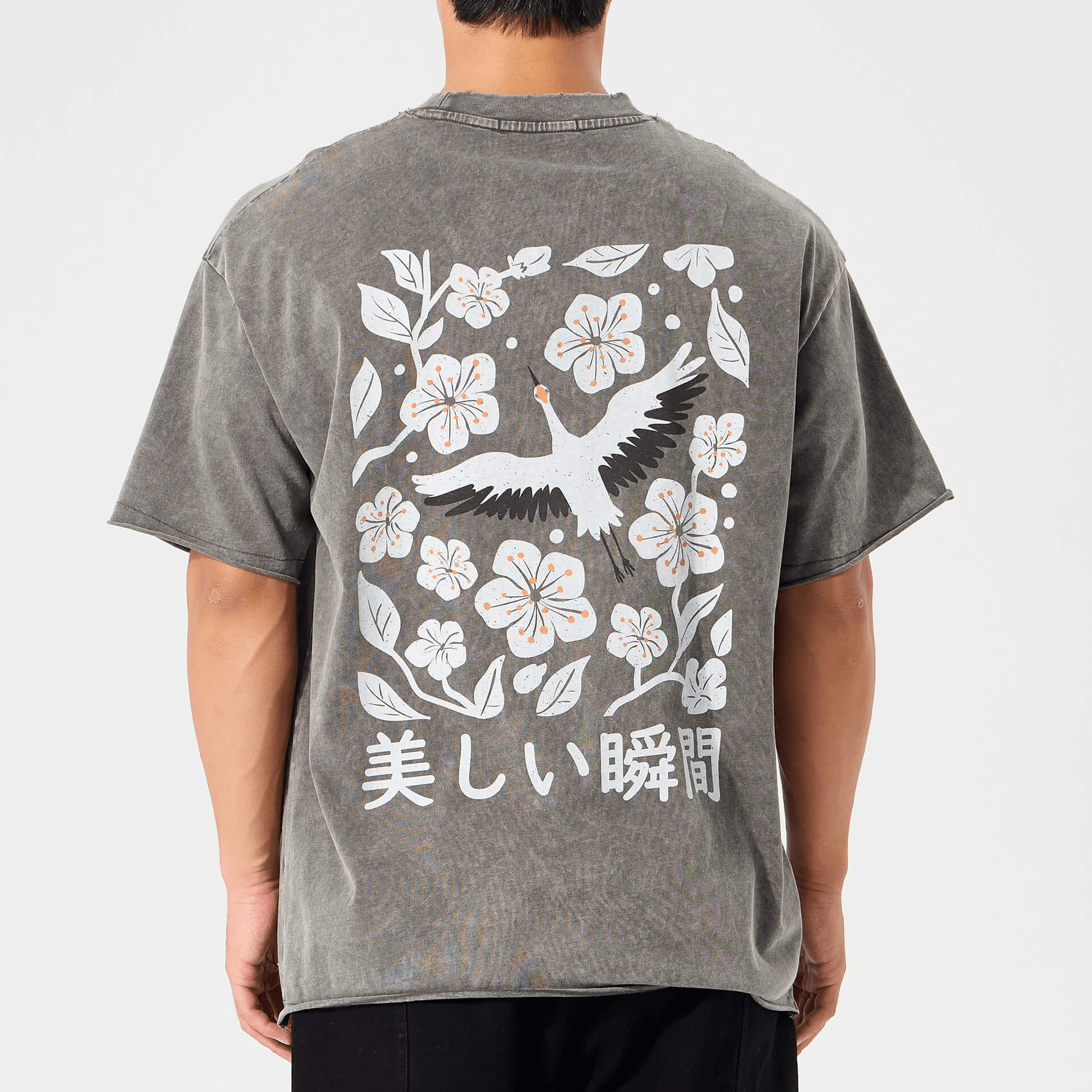 Crane Bloom Tee - named for the crane in flight and blooming sakura, symbols of grace and fleeting beauty. Finished with kanji 美しい瞬間, meaning “A Beautiful Moment.”