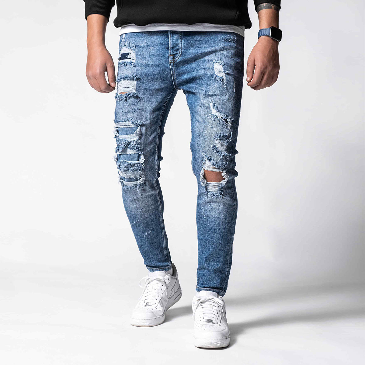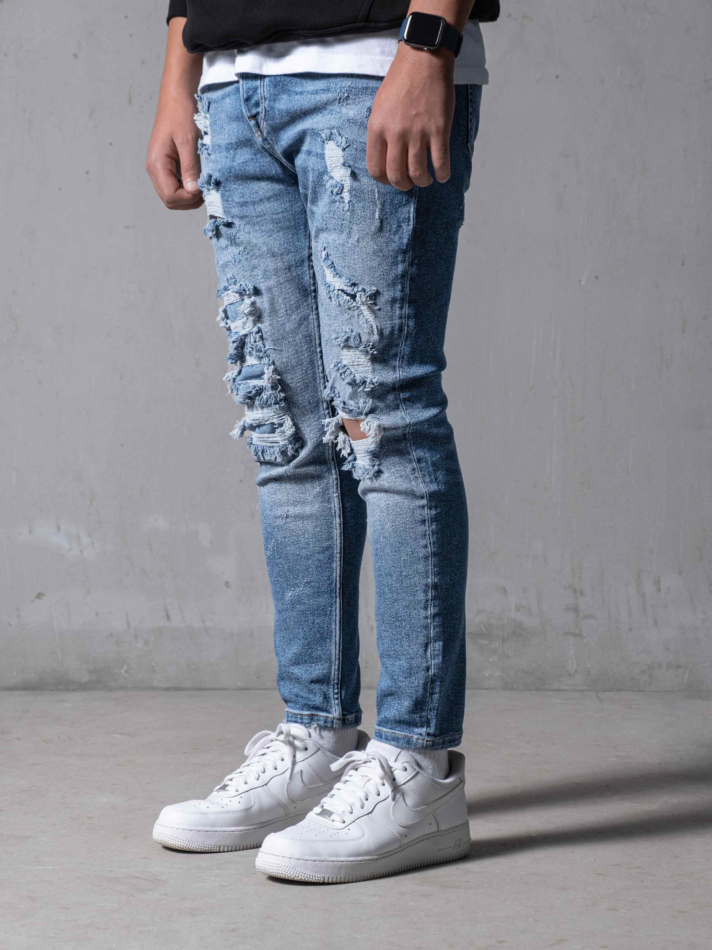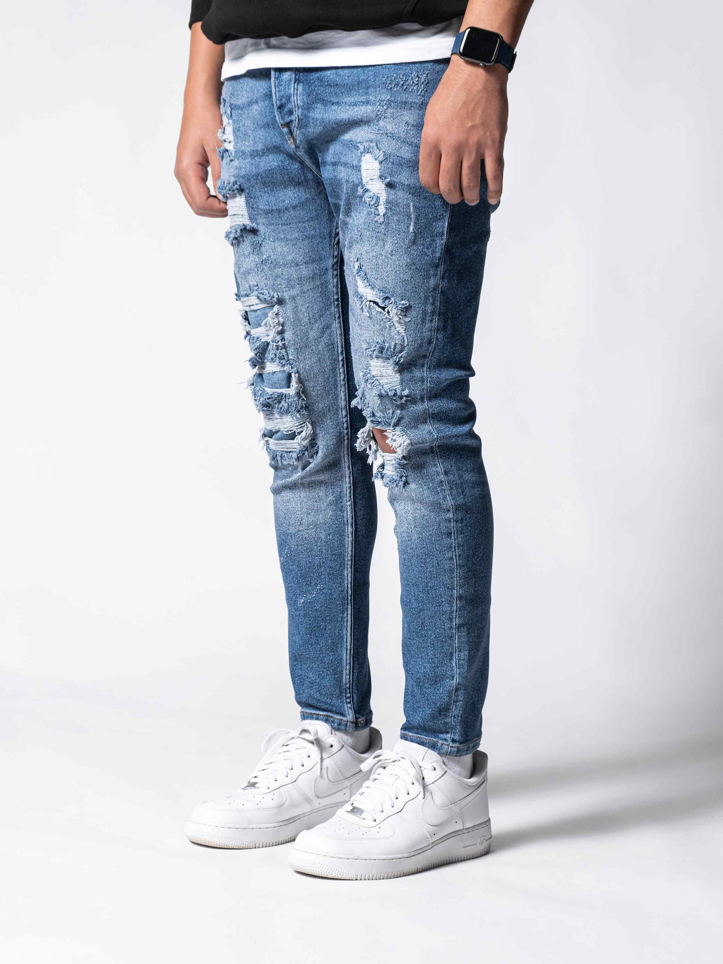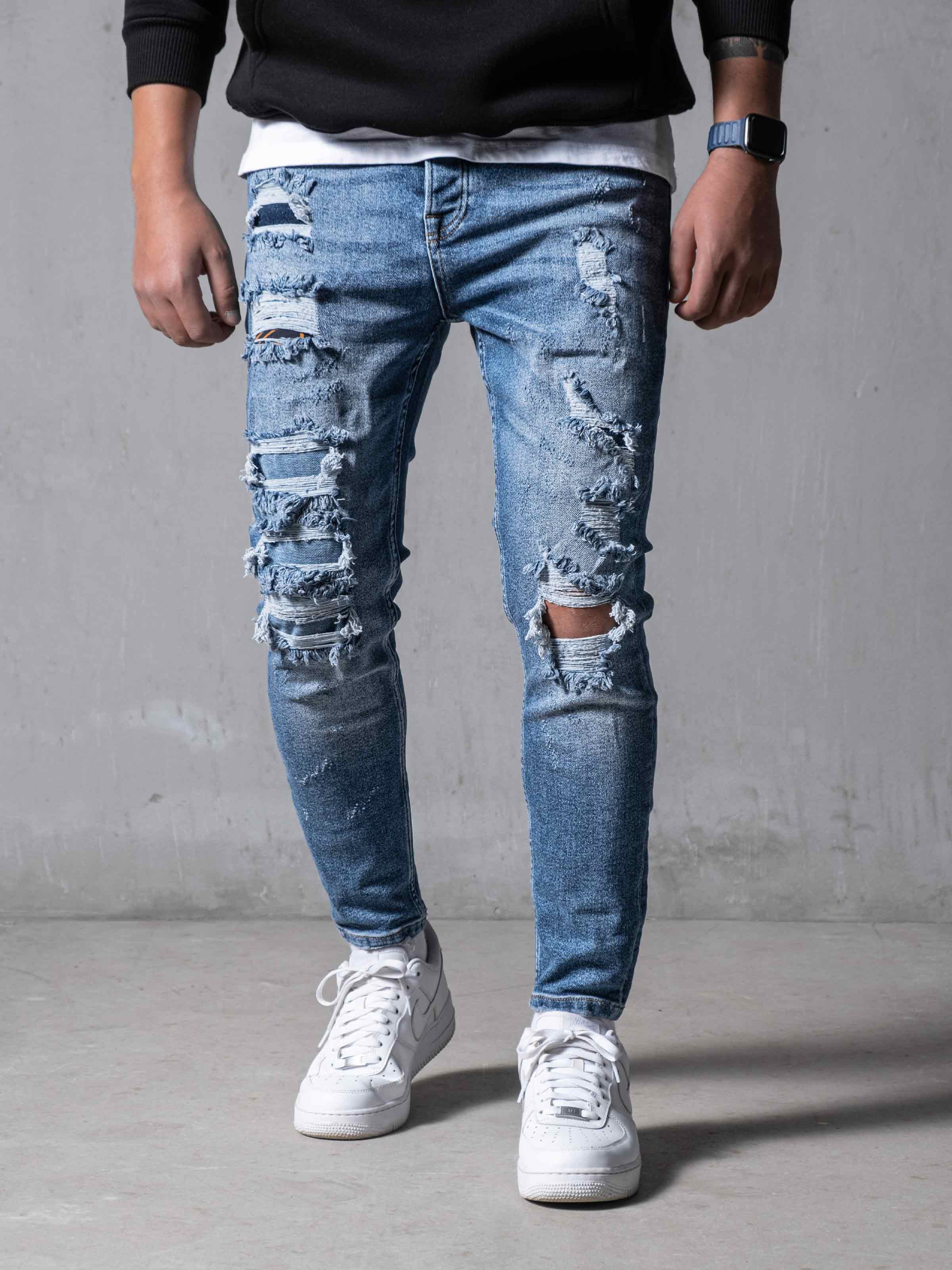 Distressed Denim Jeans are made from high-quality stretchy denim fabric. It is designed to create a rebellious vibe. We put on extra details, with stitches and rips, and a stonewashed look.