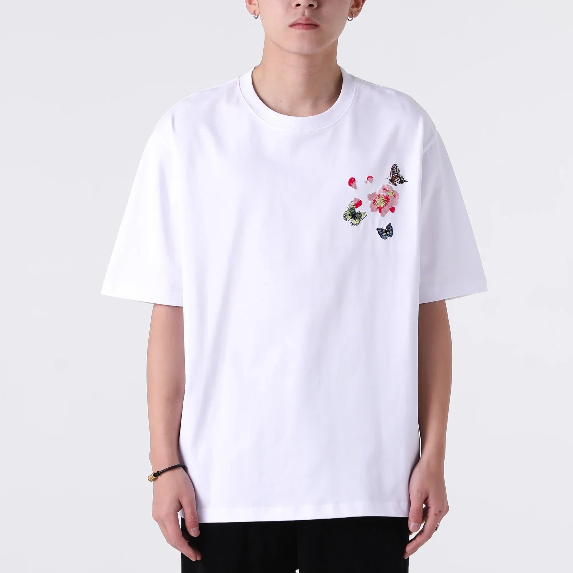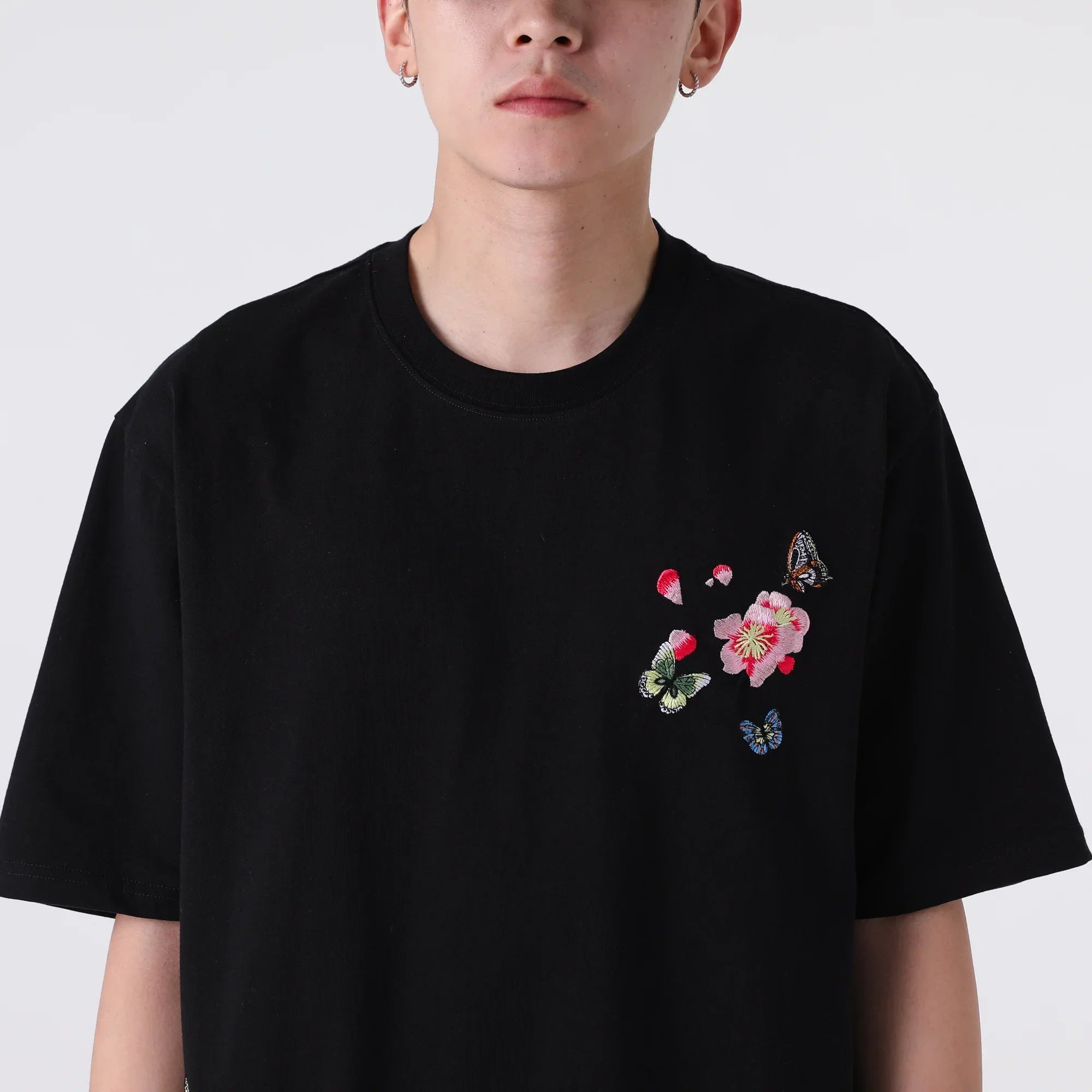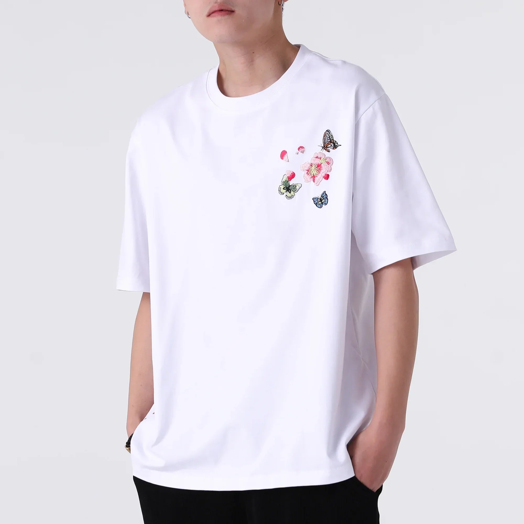 Kidoriman's Hanabira Shirt features the butterfly embroidery on the left chest, adding a touch of elegance and charm to the classic design. Available in both black and white, this t-shirt is perfect for those who appreciate simple yet stylish fashion.