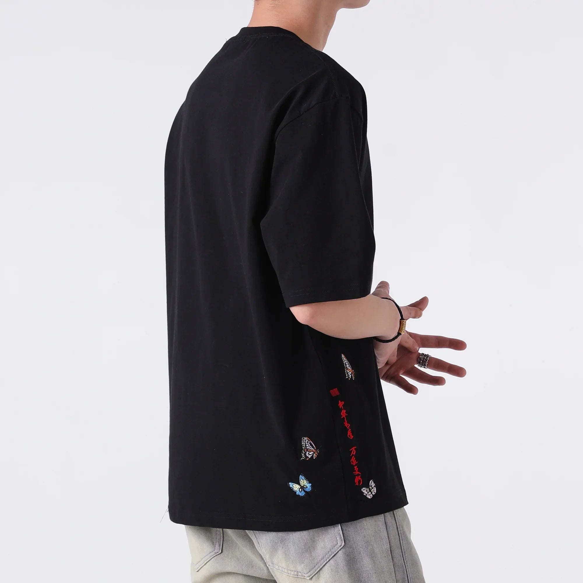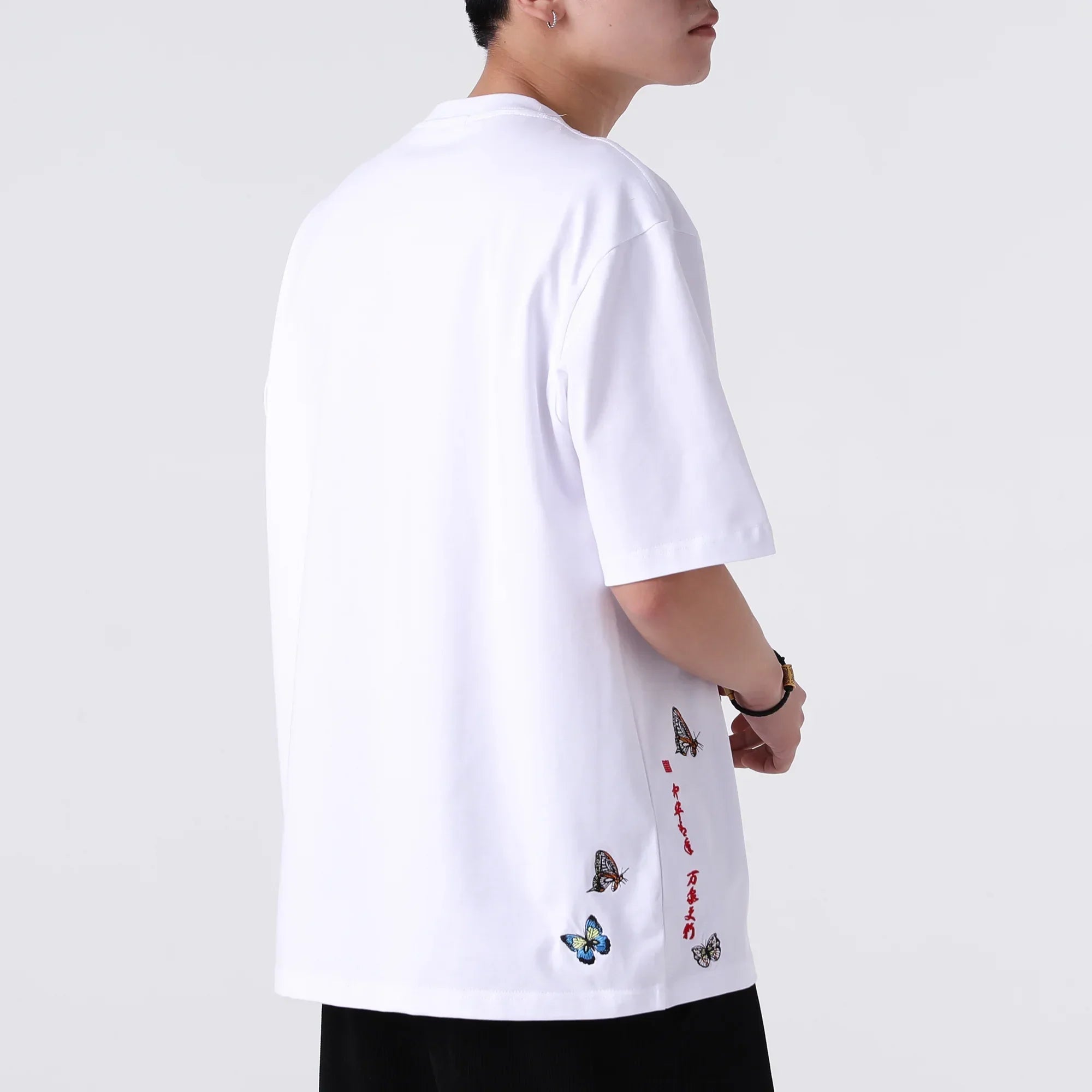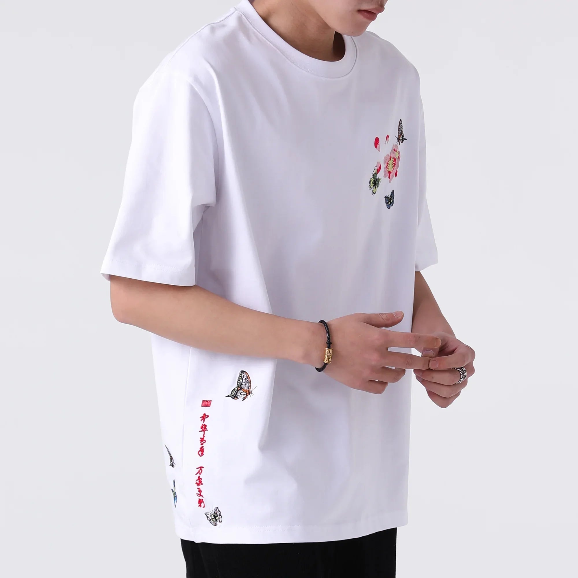 Kidoriman's Hanabira Shirt features the butterfly embroidery on the left chest, adding a touch of elegance and charm to the classic design. Available in both black and white, this t-shirt is perfect for those who appreciate simple yet stylish fashion.
