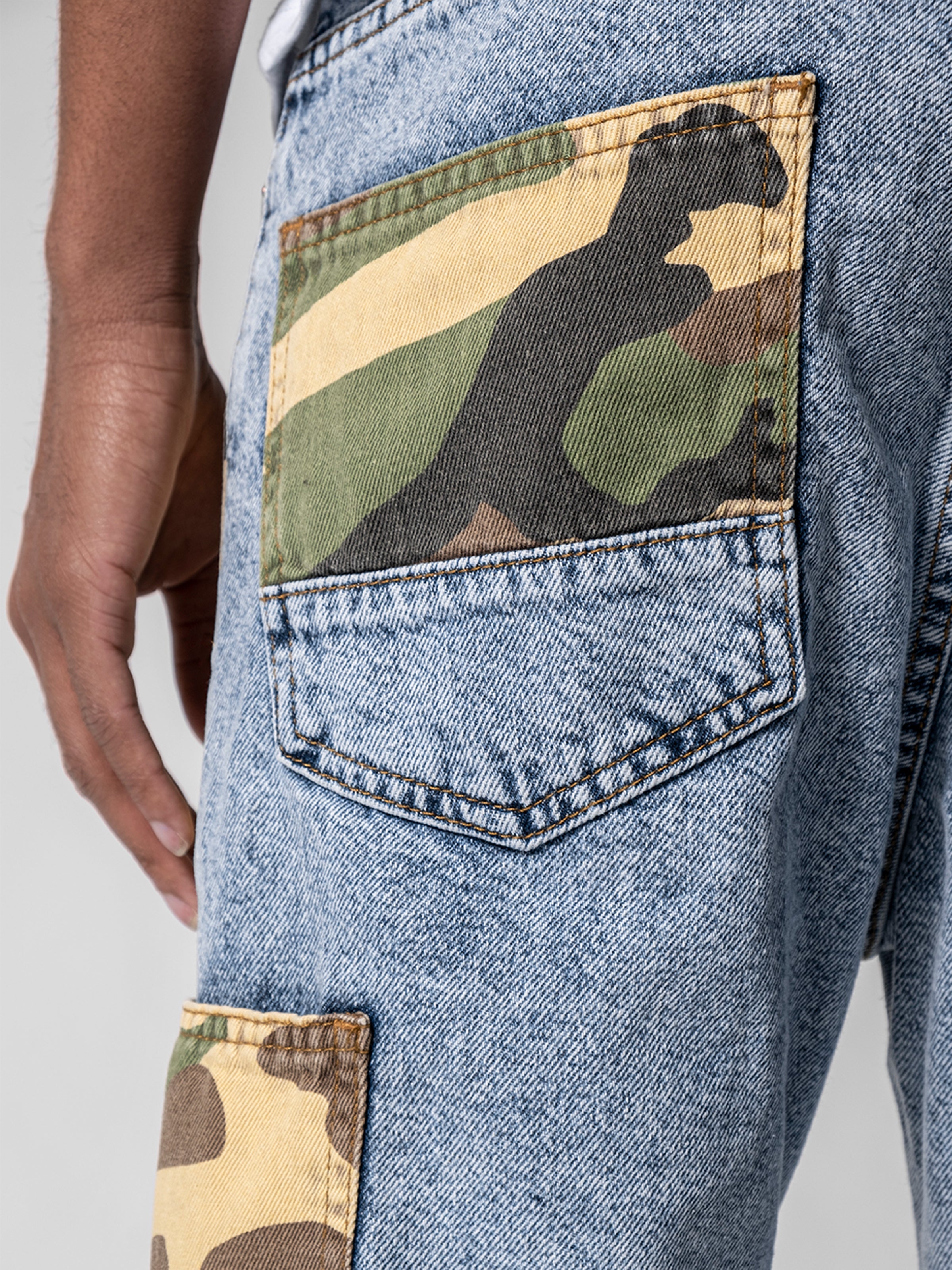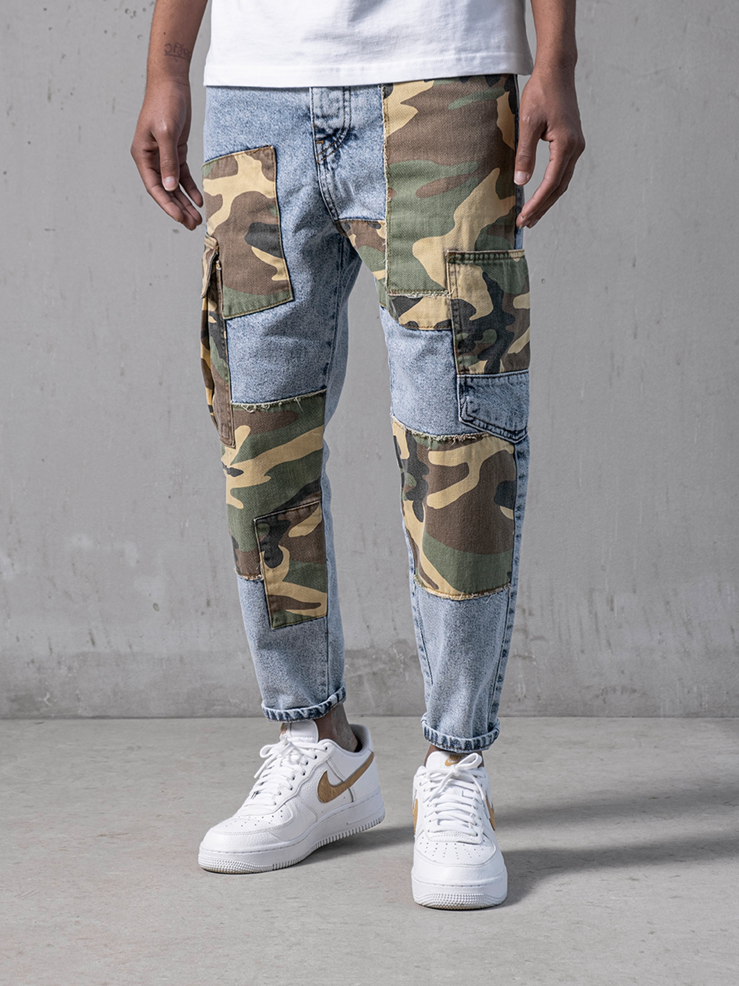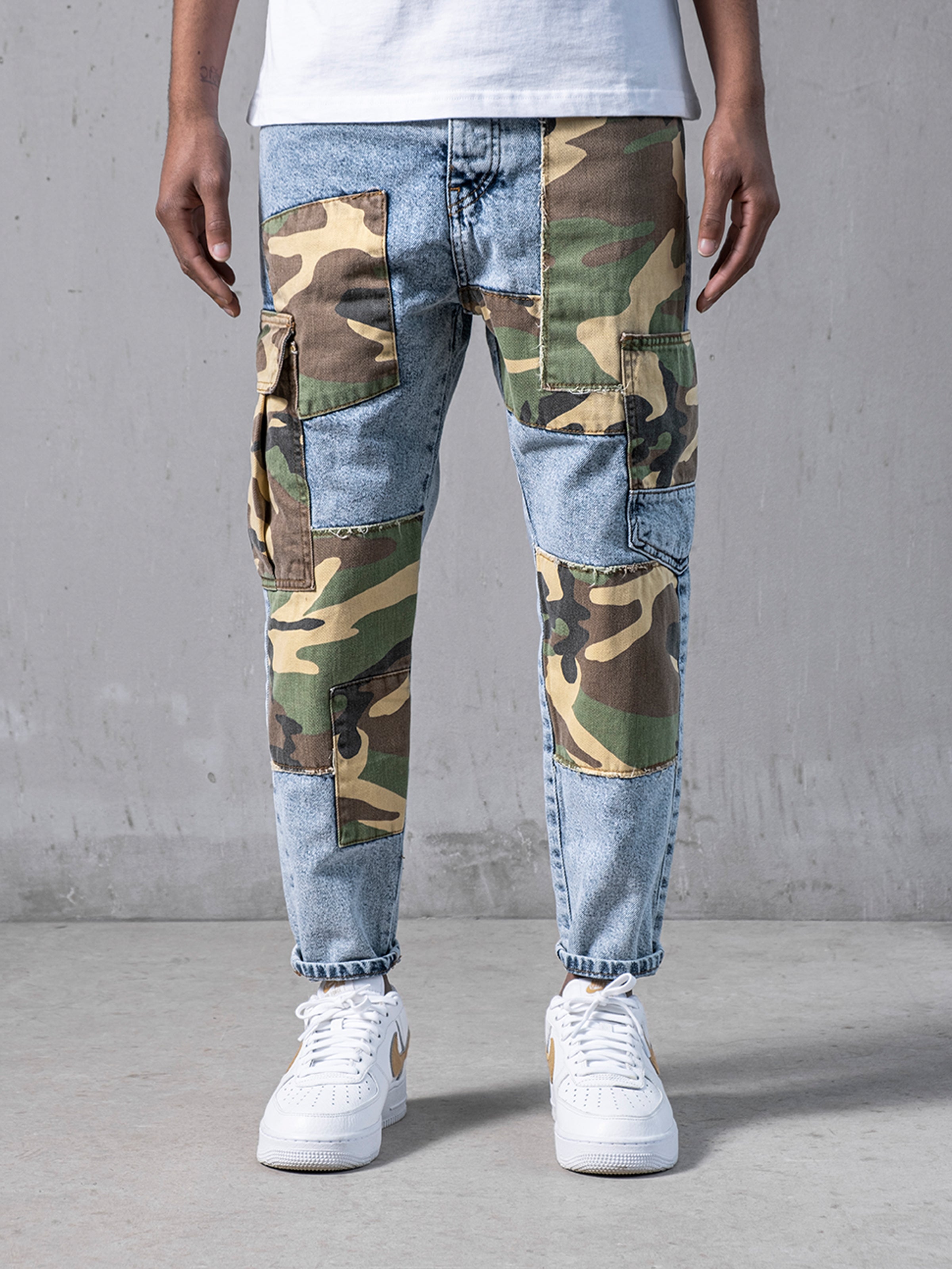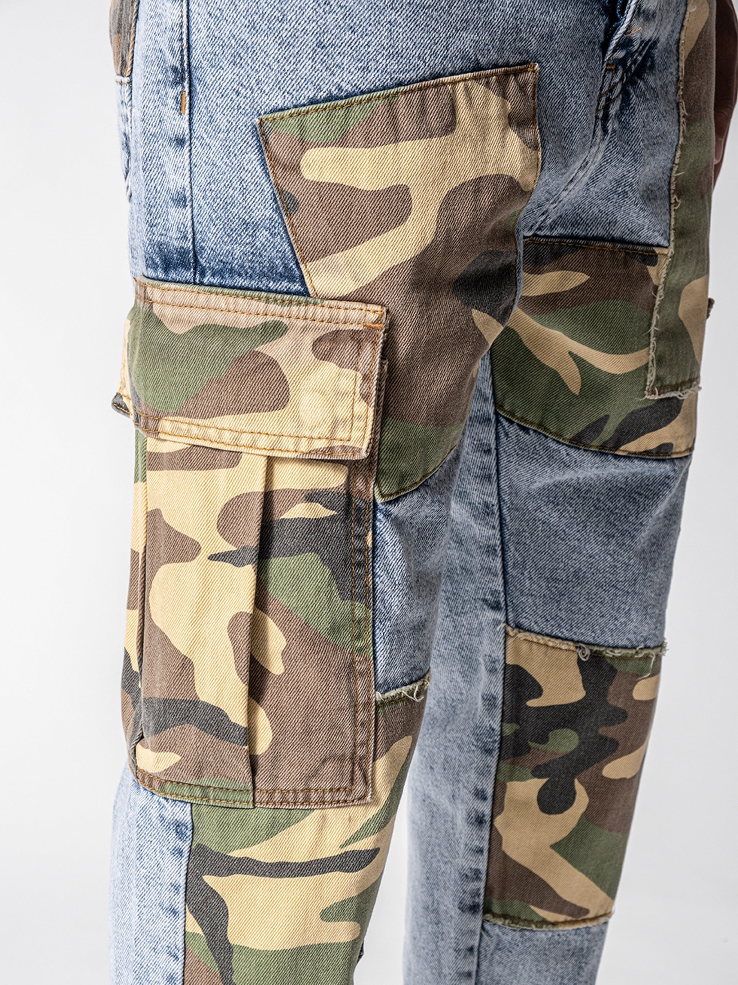 Not Exactly Camo Jeans are made from high-quality grey stretchy denim fabric and these jeans are designed with camouflage patches on both legs featuring cargo pockets on the sides of denim.