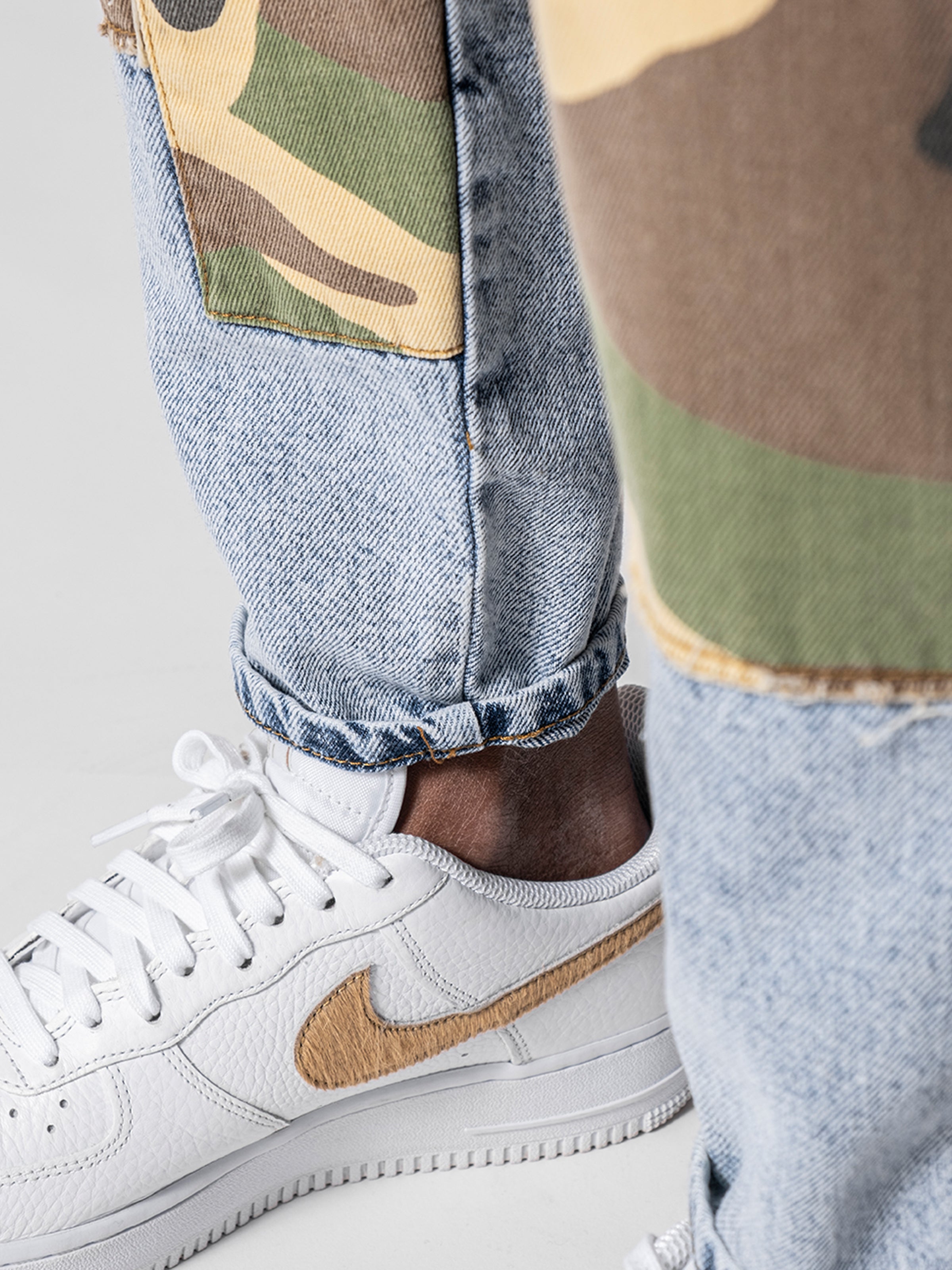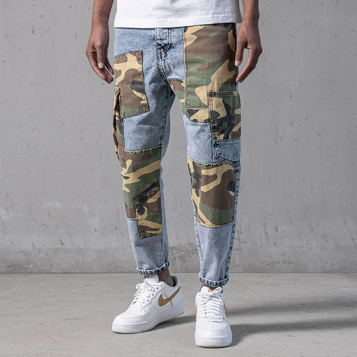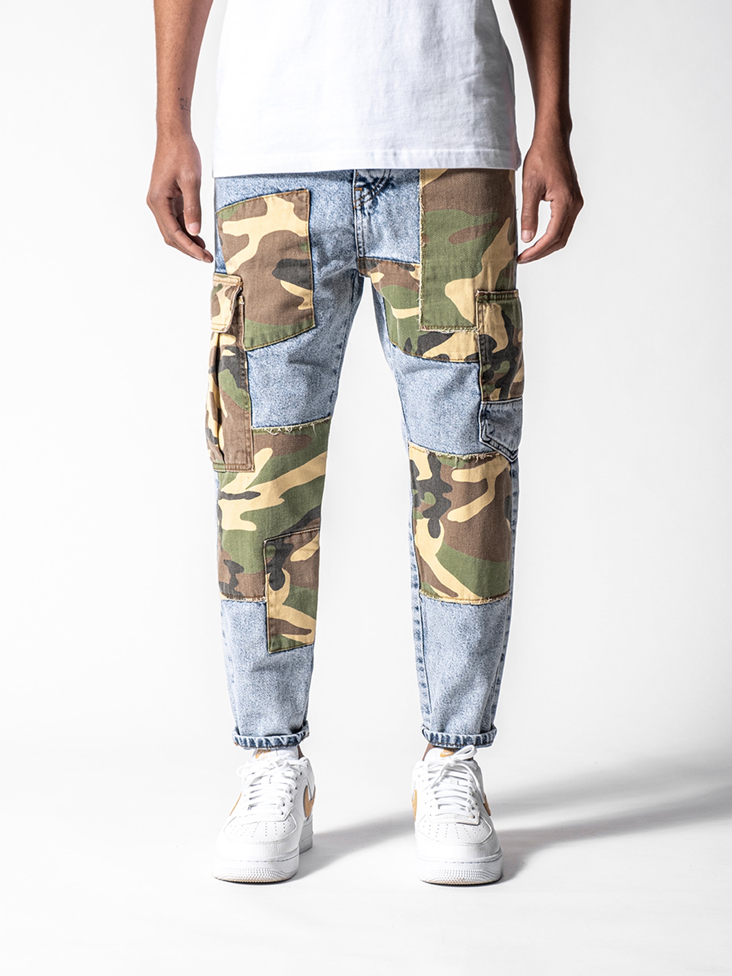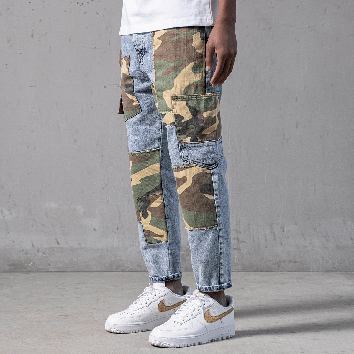 Not Exactly Camo Jeans are made from high-quality grey stretchy denim fabric and these jeans are designed with camouflage patches on both legs featuring cargo pockets on the sides of denim.