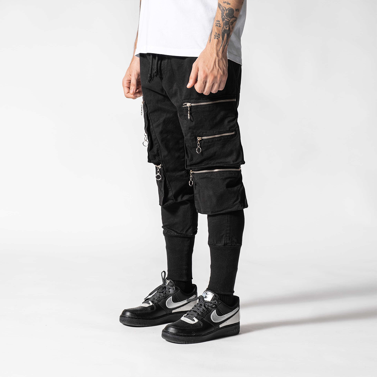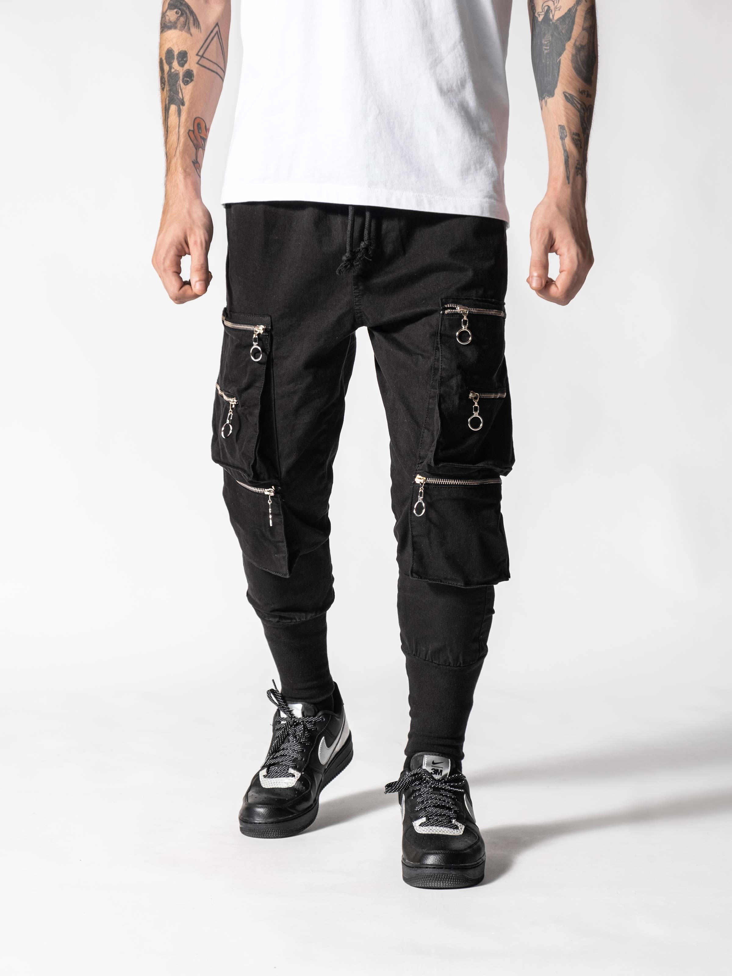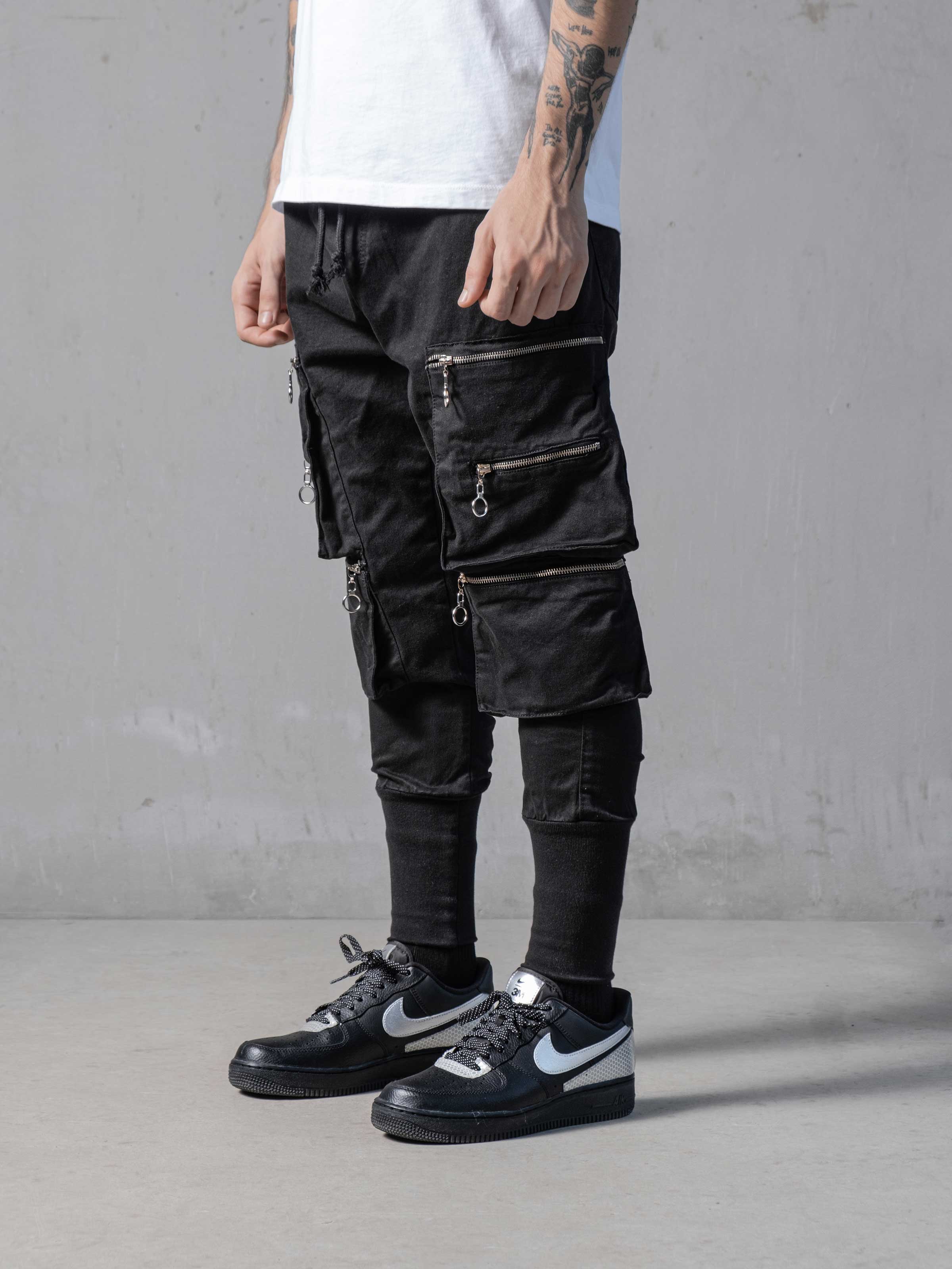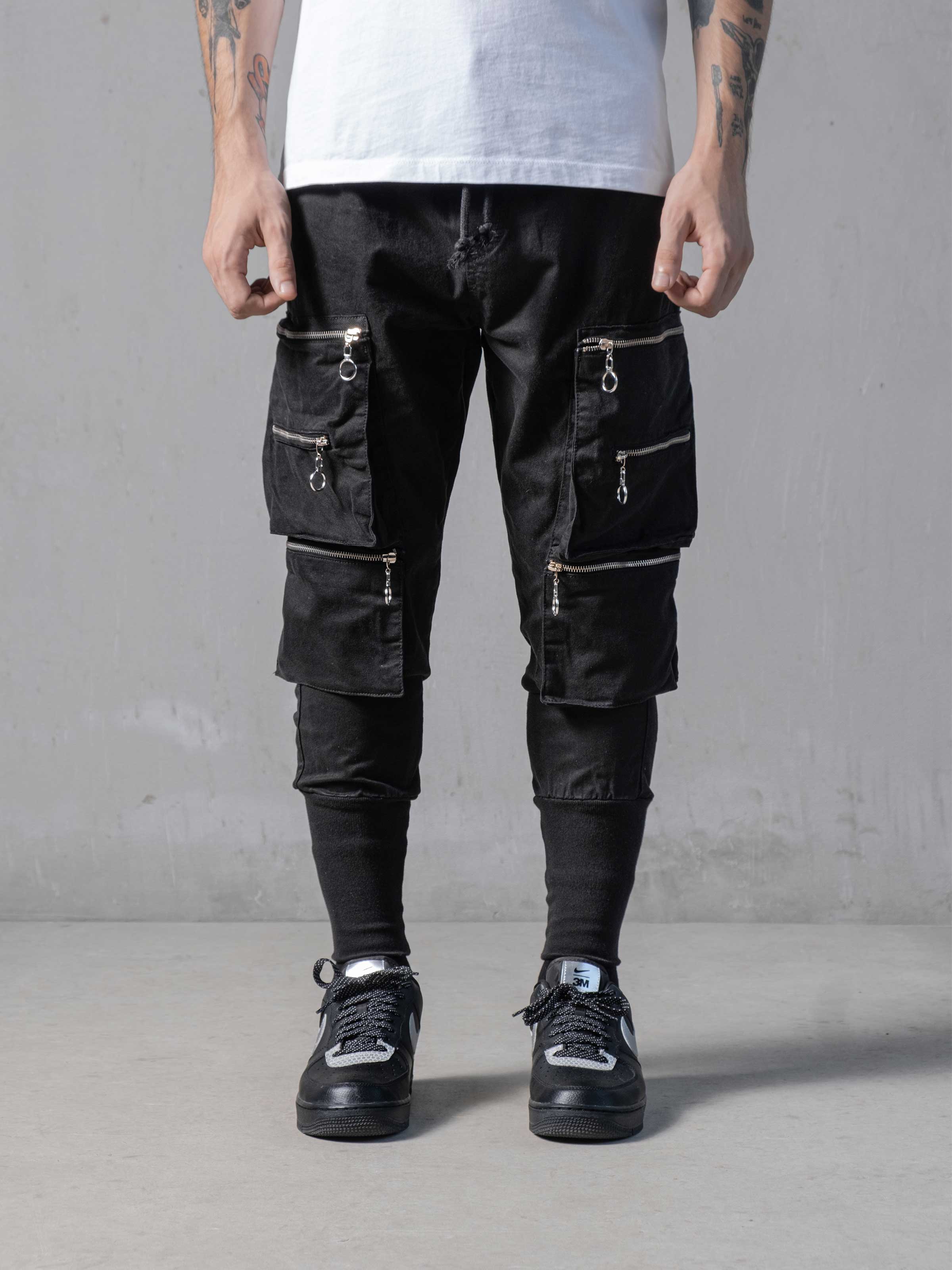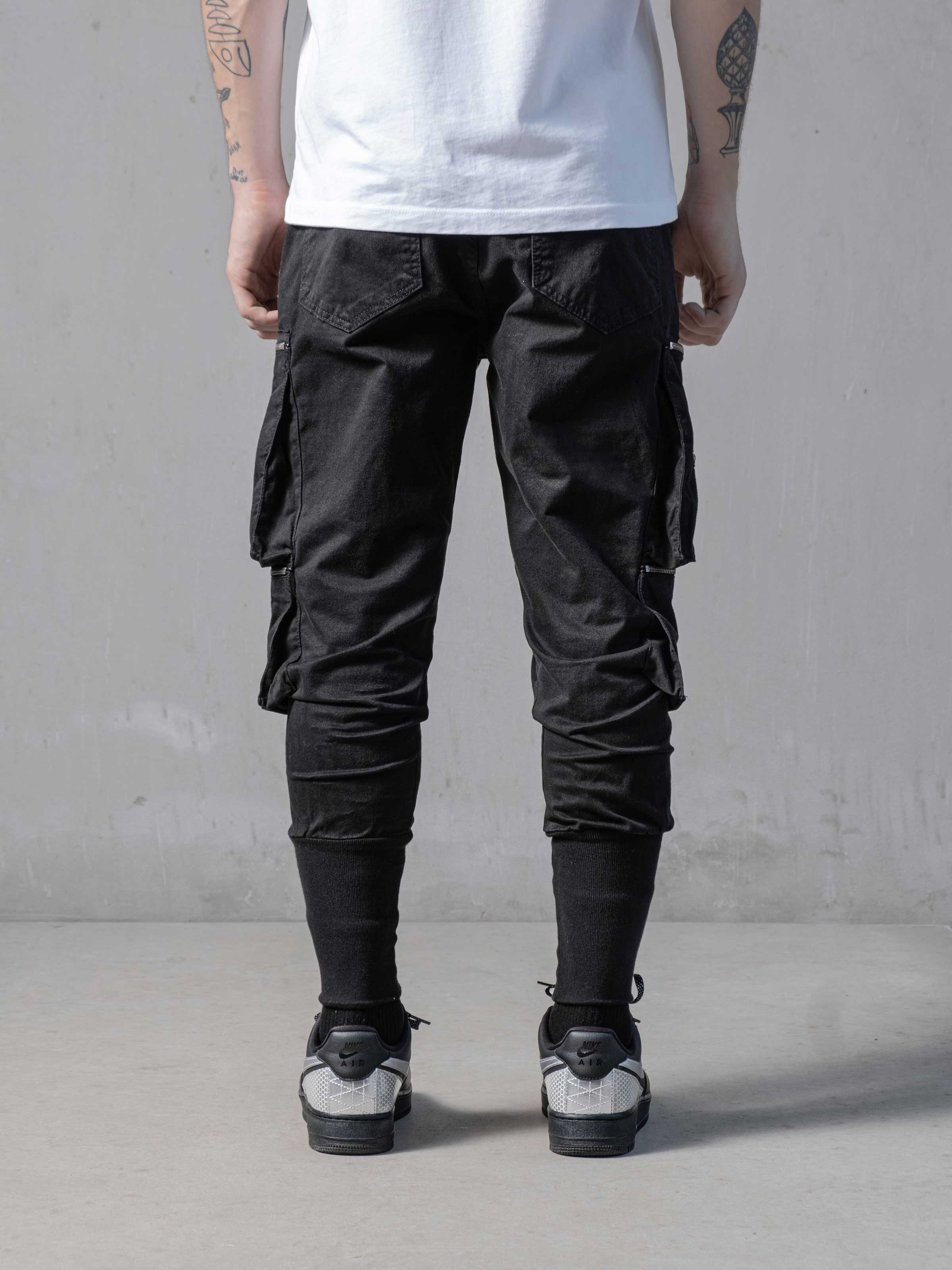 Pockets on Black Pants made from breathable custom fabric. It has a skinny fit and it gets skinnier through the ankles. As you can see there are cargo pockets on the sides with zip details.
