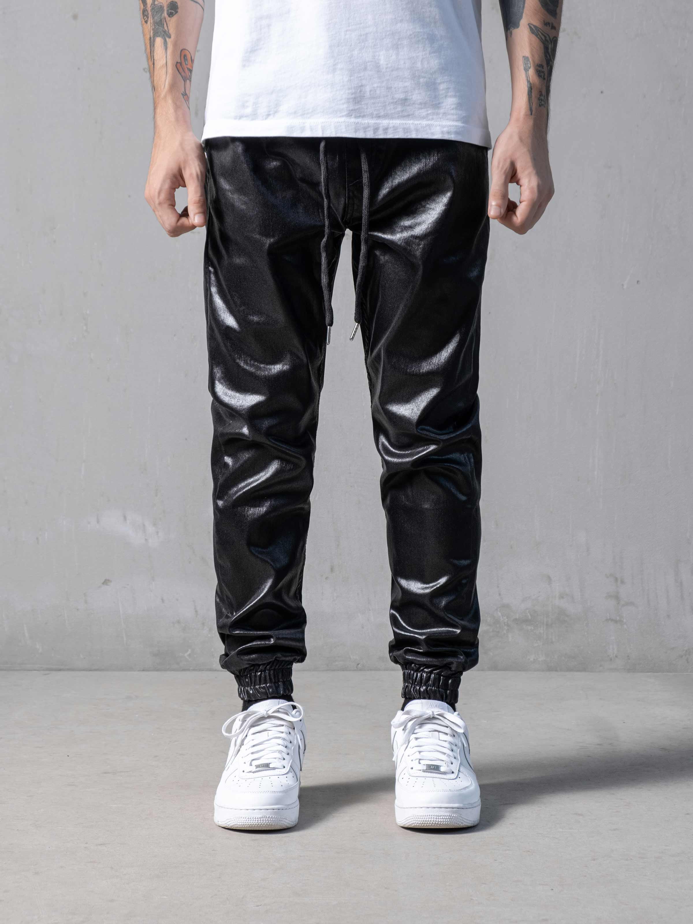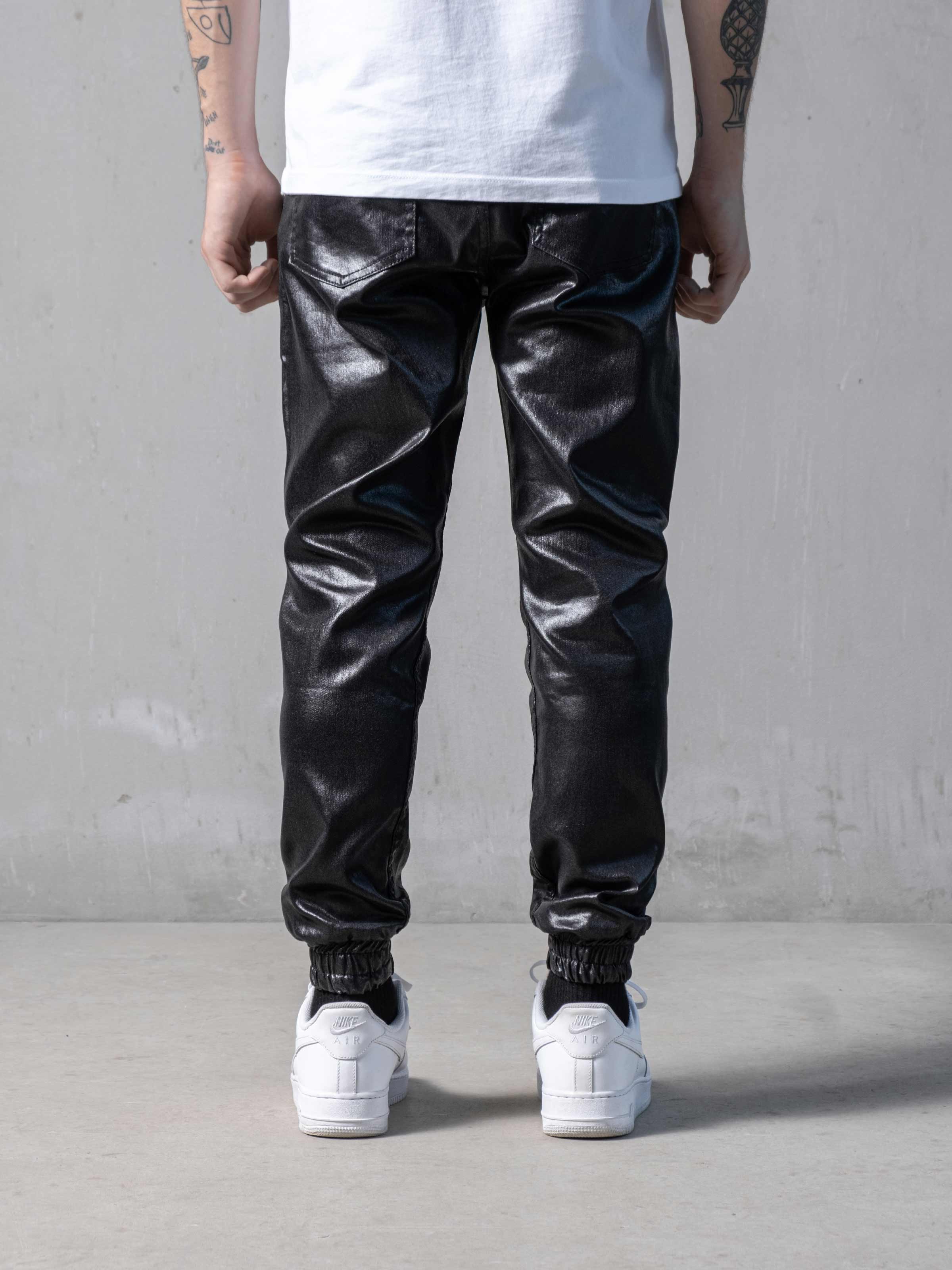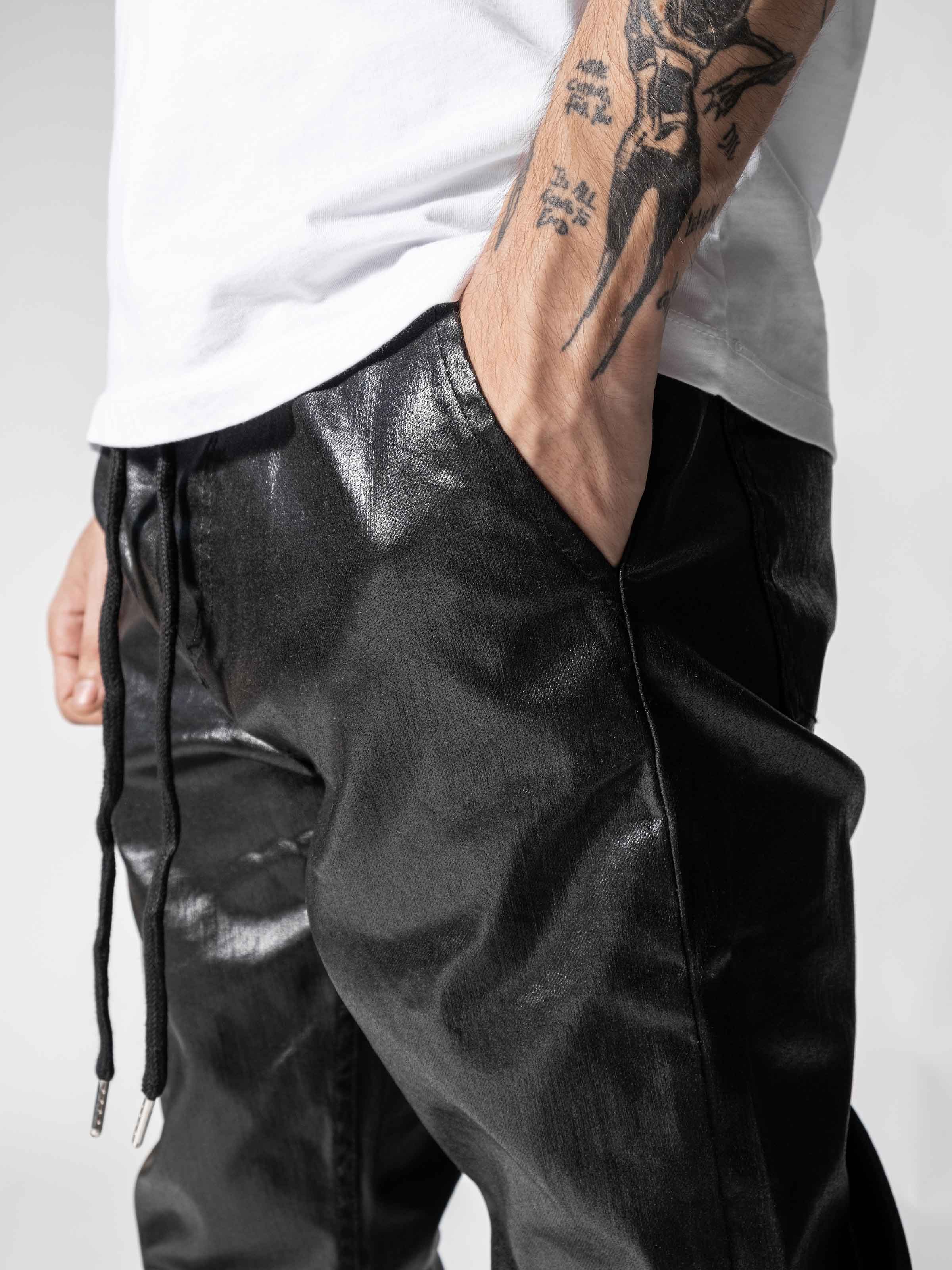 Waxed Black Pants designed slim fit features with waistband and made from leather-like custom light fabric.