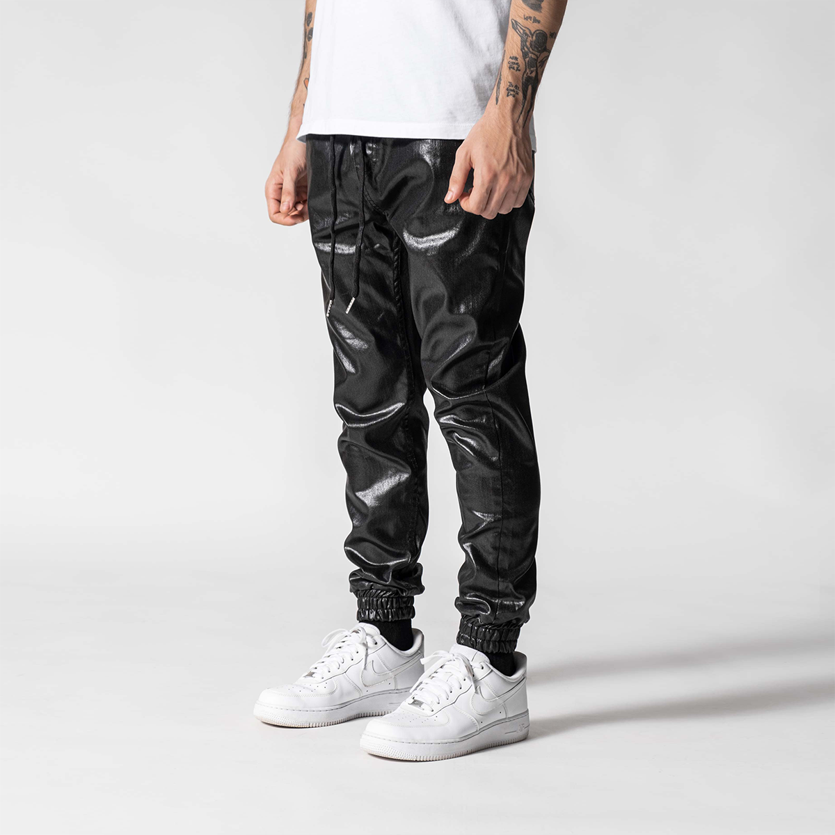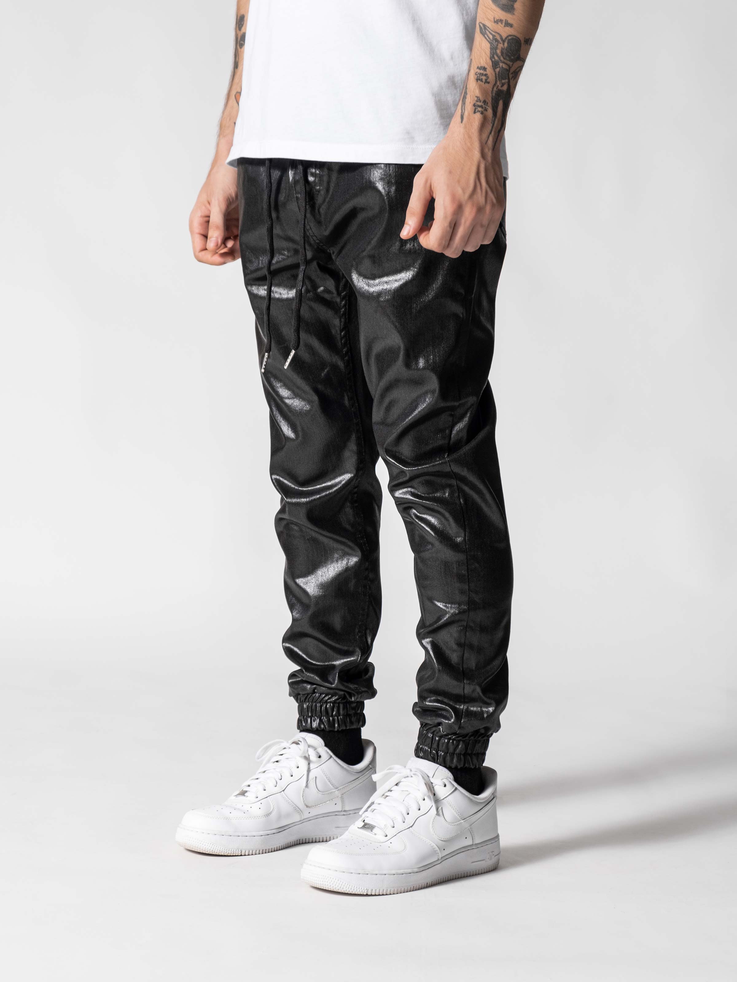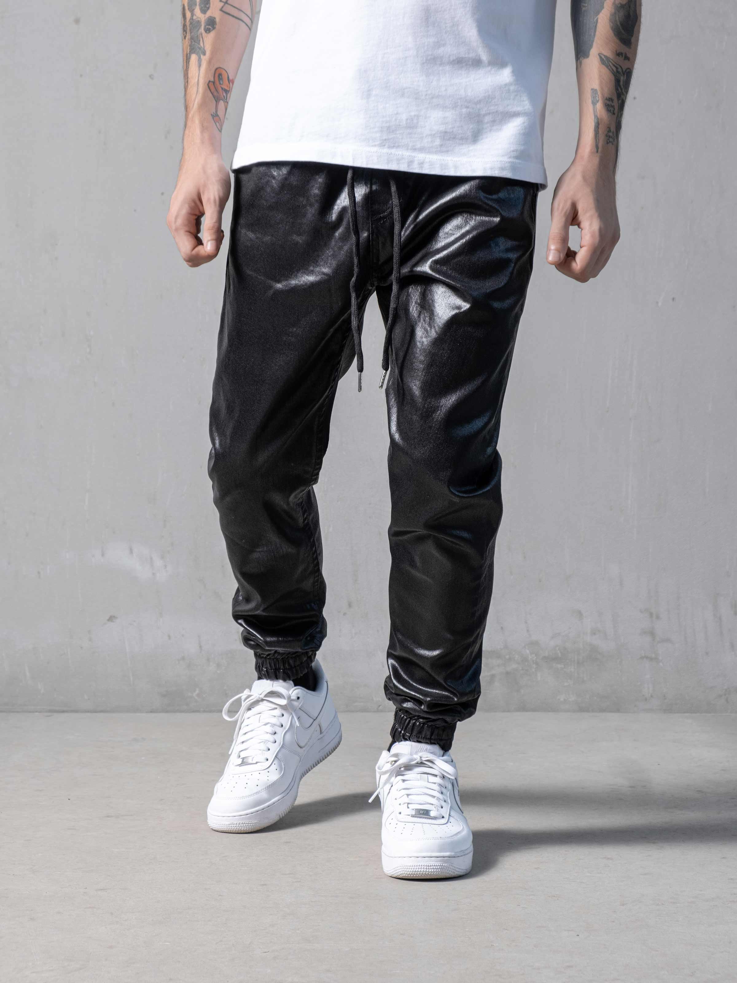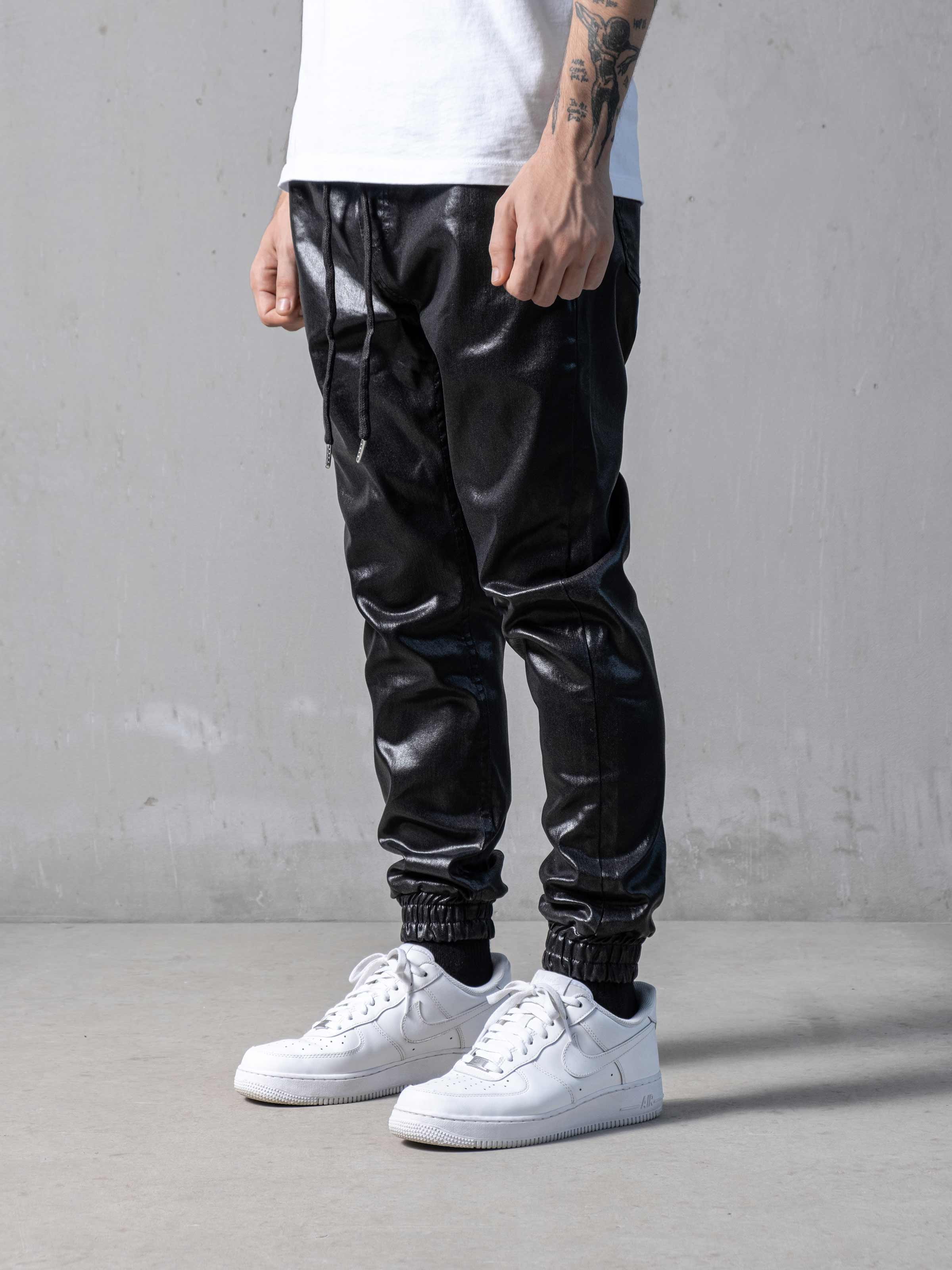 Waxed Black Pants designed slim fit features with waistband and made from leather-like custom light fabric.